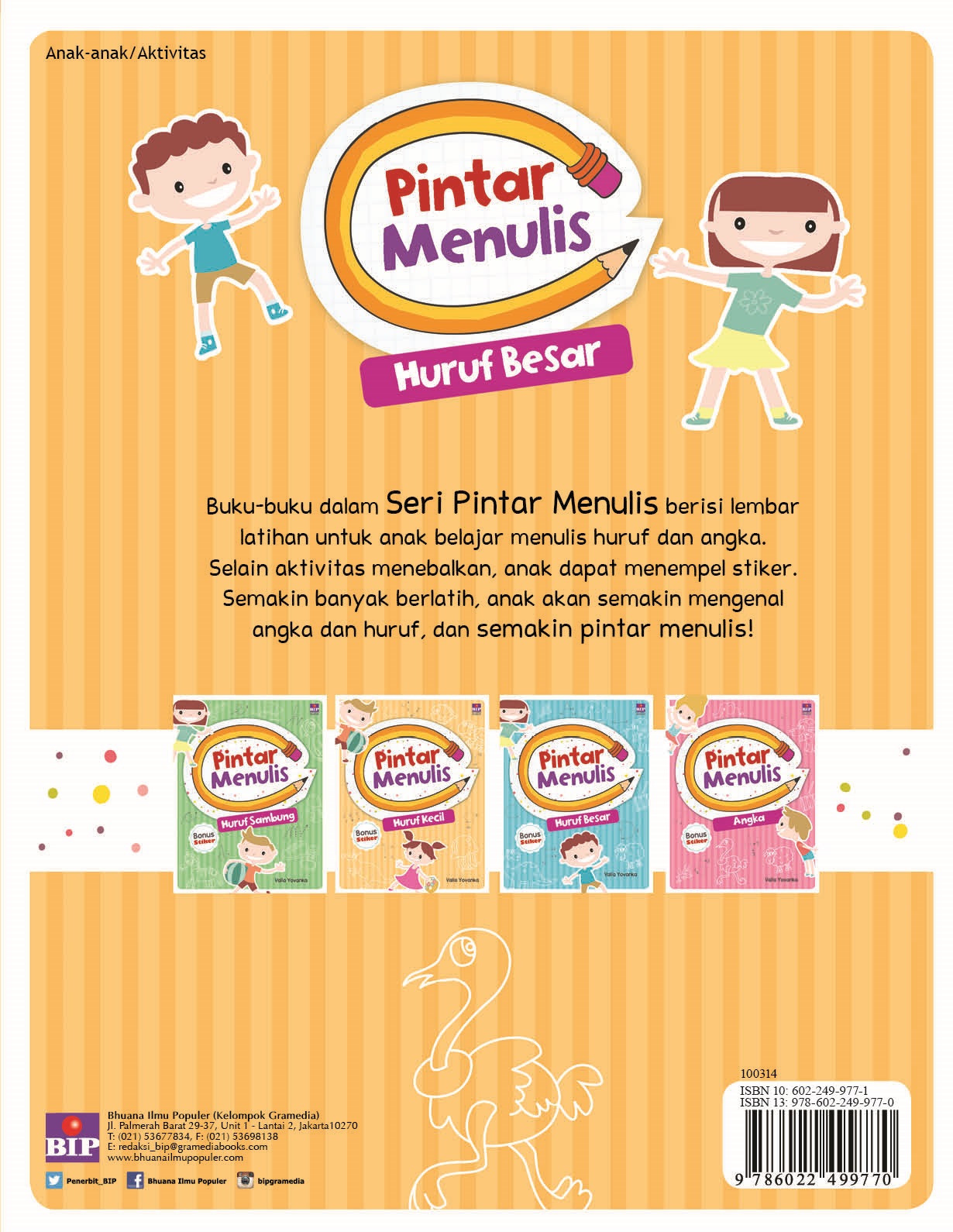 Buku ini adalah buku latihan menulis untuk PAUD. Terdiri empat judul: Huruf Kecil-Huruf Besar-Huruf Sambung dan Angka. Buku ini dilengkapi dengan latihan mewarnai dan menempel stiker sebagai variasi latihan motorik halus anak.