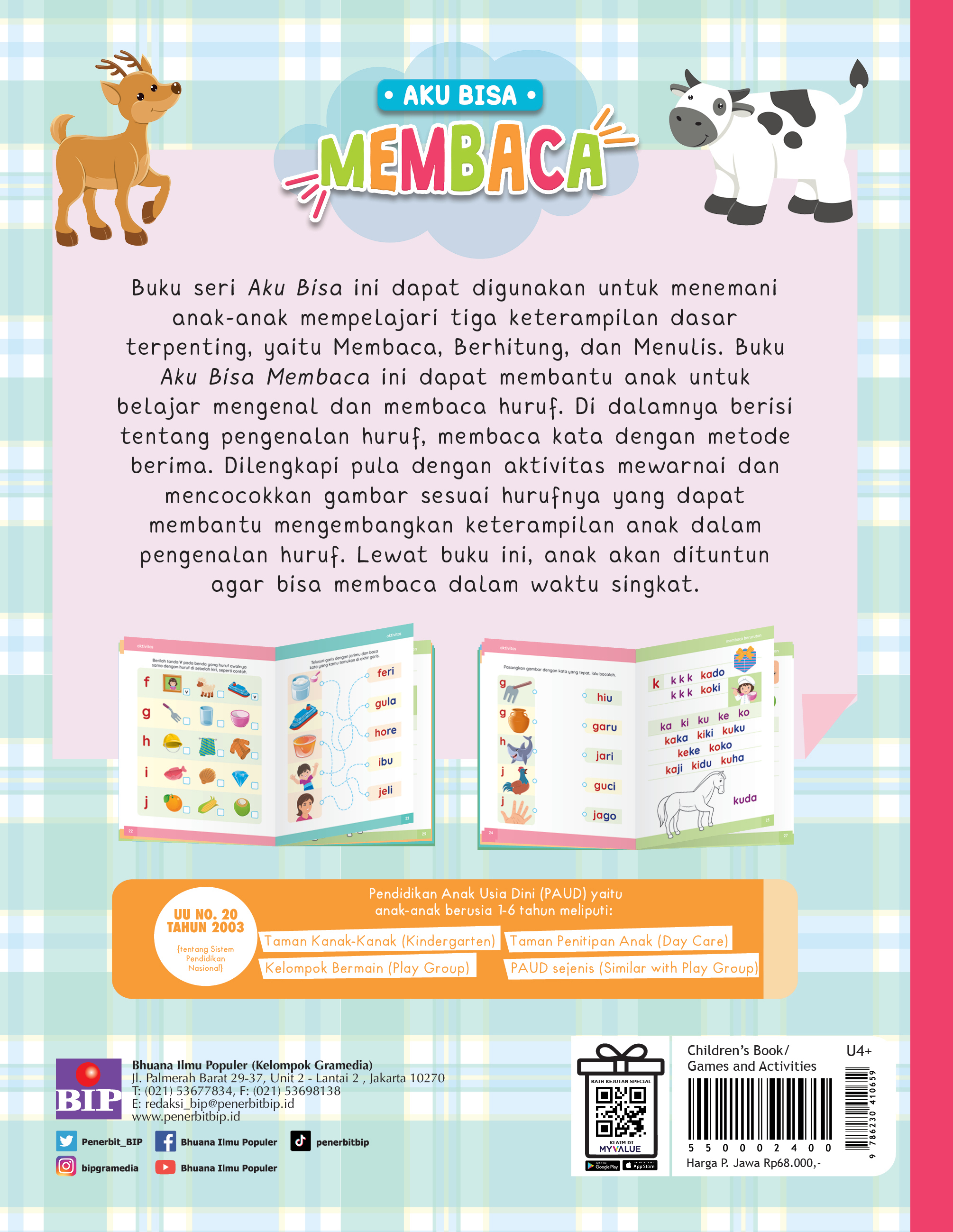 Membaca adalah salah satu kegiatan yang bermanfaat untuk semua orang. Banyak hal yang bisa diperoleh dalam kehidupan pada orang yang rajin membaca. Oleh karena itu, mengajarkan dan membiasakan anak untuk membaca sejak dini adalah salah satu tugas orangtua. Mengajarkan anak membaca tentu membutuhkan keseriusan dan kesabaran bagi para orangtua dan guru. Diperlukan teknik atau metode yang efektif serta efisien dalam mengajarkan anak membaca dengan hasil yang cepat. Mengajarkan anak balita atau TK supaya bisa membaca sangat mudah dan terbilang sederhana. Orangtua hanya perlu memiliki kunci sukses yaitu prosesnya yang menyenangkan karena di usianya, bermain yang paling utama. Buku Buku Aku Bisa Membaca dapat dijadikan alternatif dalam mengajarkan anak membaca di usia dini. Disajikan dalam metode yang mudah dan sederhana, yaitu tanpa menghafal huruf dan tanpa mengeja. Di dalamnya berisi tentang pengenalan huruf, membaca kata dengan metode berima. Dilengkapi pula dengan aktivitas mewarnai dan mencocokkan gambar sesuai hurufnya yang dapat membantu mengembangkan keterampilan anak dalam pengenalan huruf. Lewat buku ini, anak akan dituntun agar bisa membaca dalam waktu singkat.Setiap hari anak diharapkan dapat belajar sekaligus berlatih membaca dimulai dari membaca suku kata, kata, kemudian kalimat sederhana.