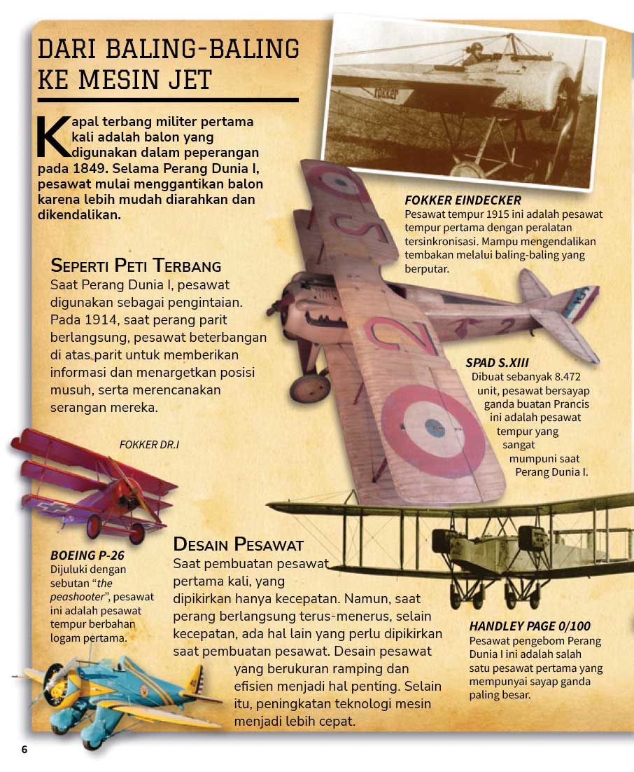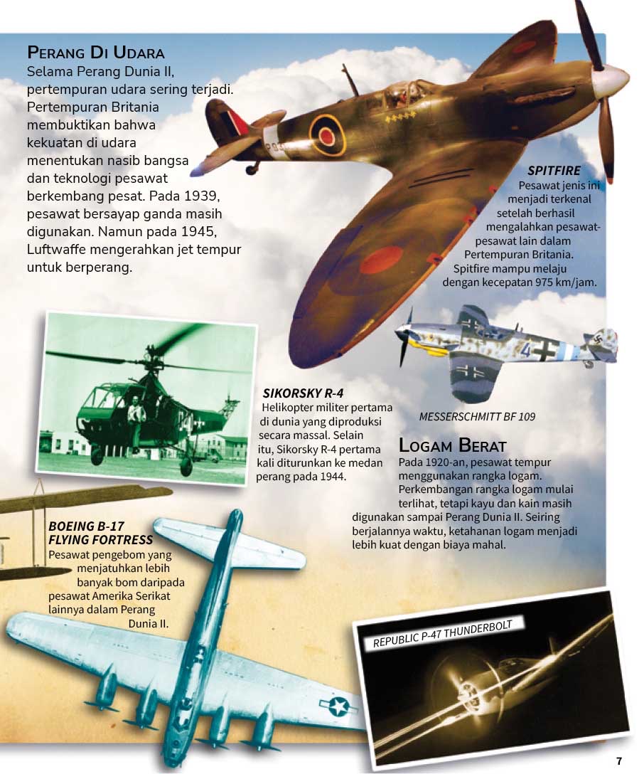 Selain itu, ada juga kapal udara militer yang beroperasi pertama kali saat Perang Dunia I, helikopter tempur bersenjata paling canggih di dunia dengan mesin-mesin terbaru. Ilustrasi di dalamnya pun sangat detail dan memukau karena menggunakan teknologi komputer 3D terbaru.