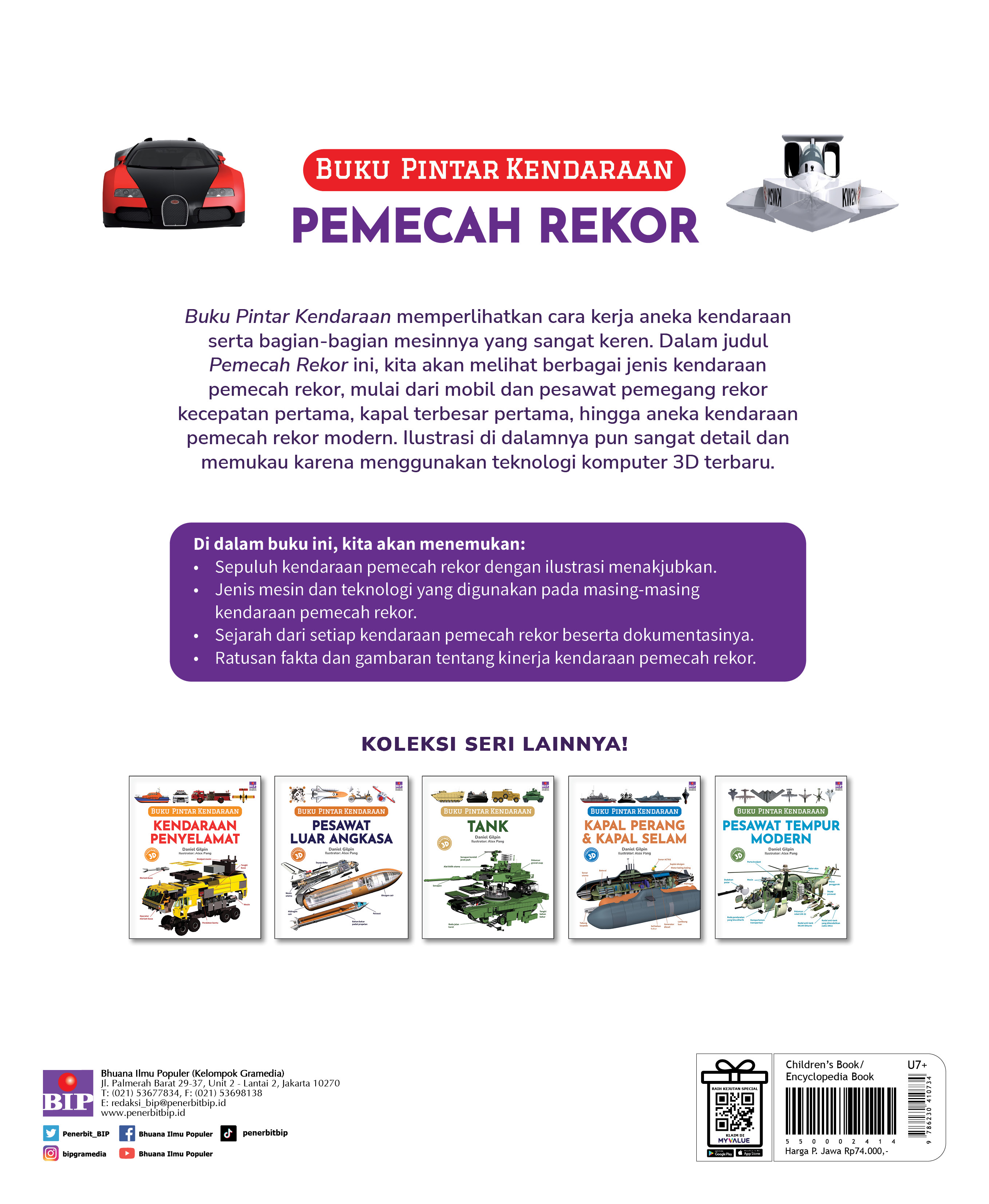 Buku Pintar Kendaraan memperlihatkan cara kerja aneka kendaraan serta bagian-bagian mesinnya yang sangat keren. Dalam judul Pemecah Rekor ini, kita akan melihat berbagai jenis kendaraan pemecah rekor, mulai dari mobil dan pesawat pemegang rekor kecepatan pertama, kapal terbesar pertama, hingga aneka kendaraan pemecah rekor modern. Ilustrasi di dalamnya pun sangat detail dan memukau karena menggunakan teknologi komputer 3D terbaru.
