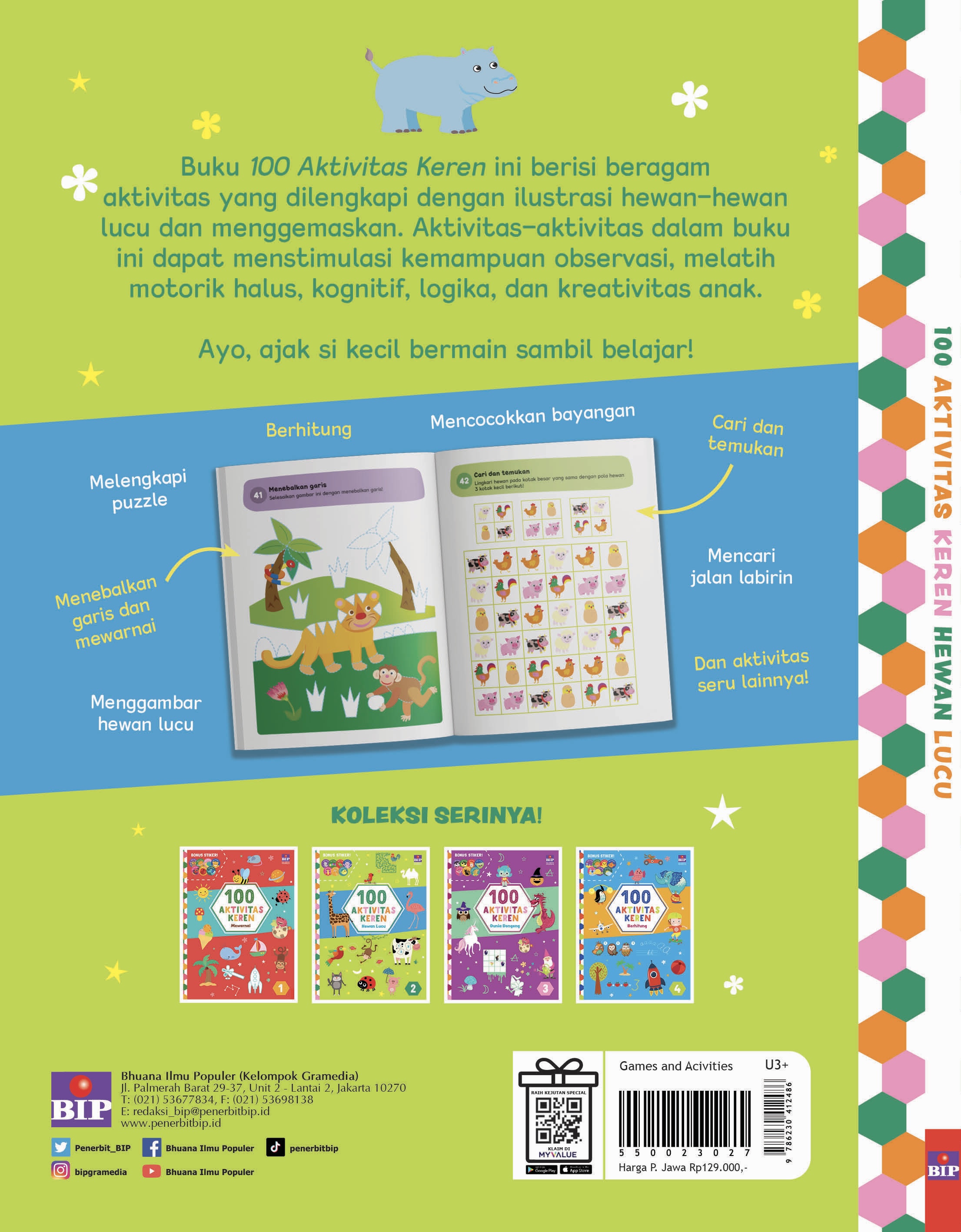 aktivitas yang dilengkapi dengan ilustrasi lucu dan menggemaskan. 100 aktivitas dalam buku ini dapat menstimulasi kemampuan observasi, melatih