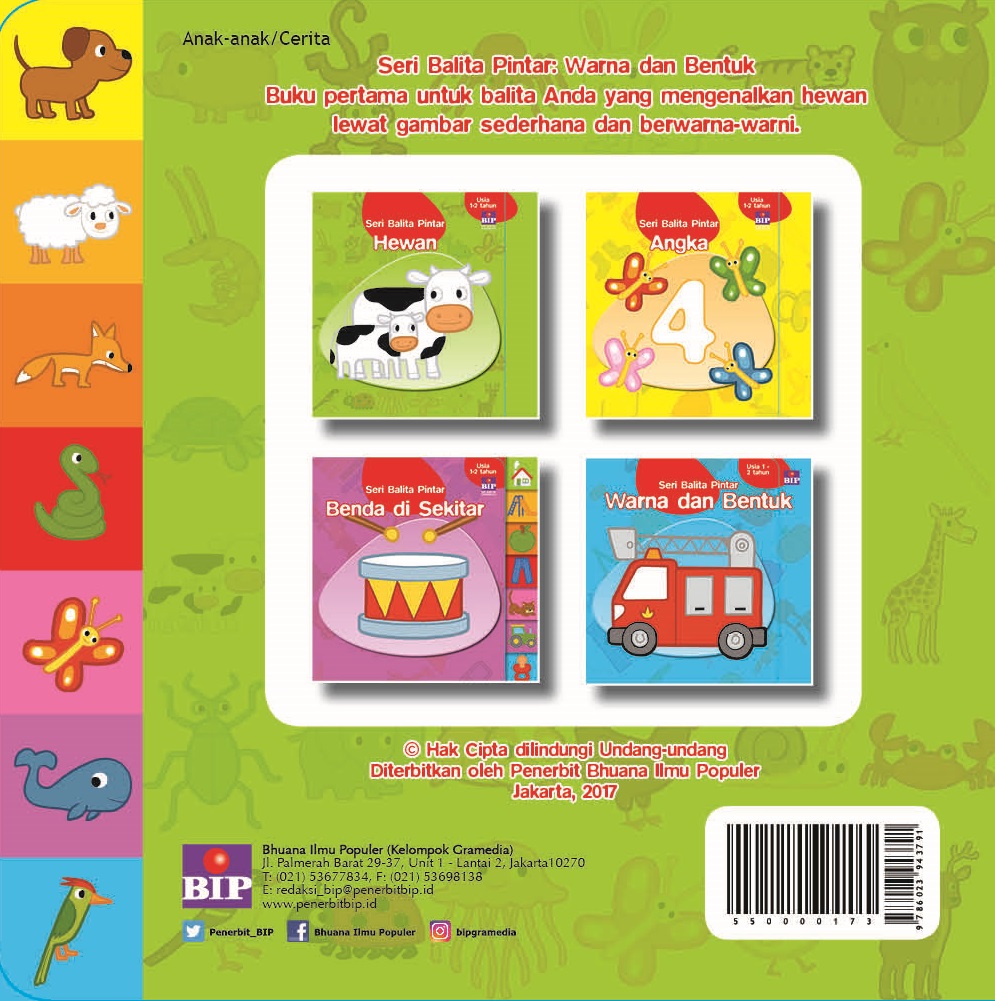 Buku pertama untuk balita Anda yang mengenalkan hewan di darat, di laut, di peternakan, hewan piaraan, dan serangga, lewat gambar sederhana dan berwarna-warni.