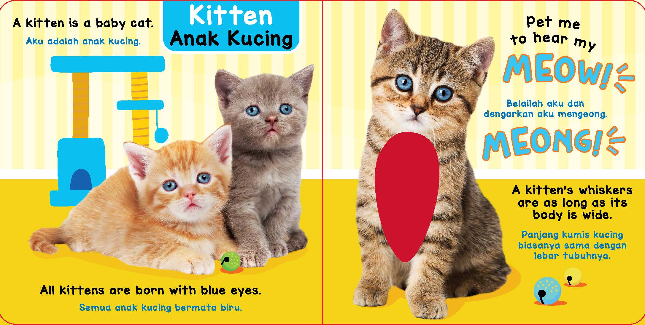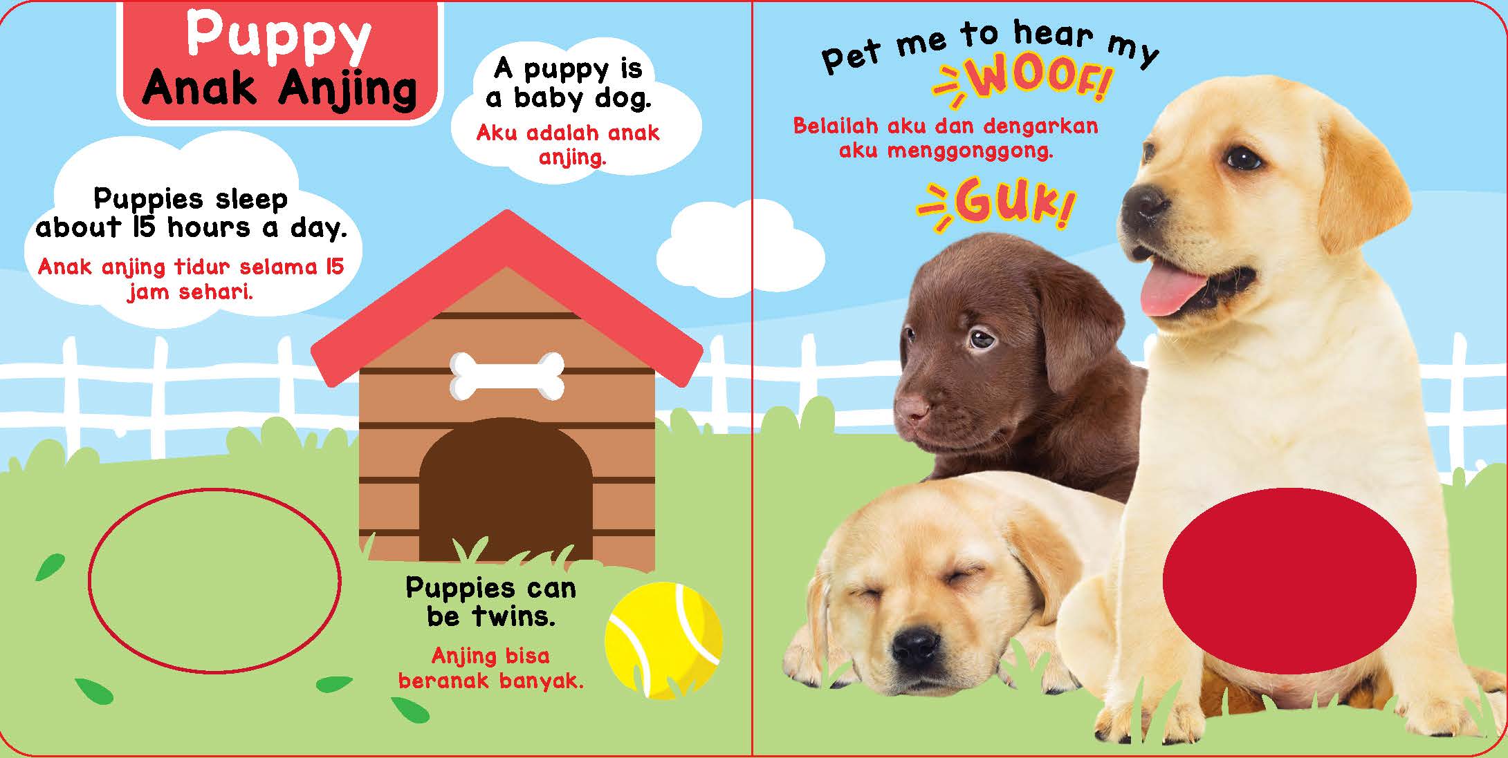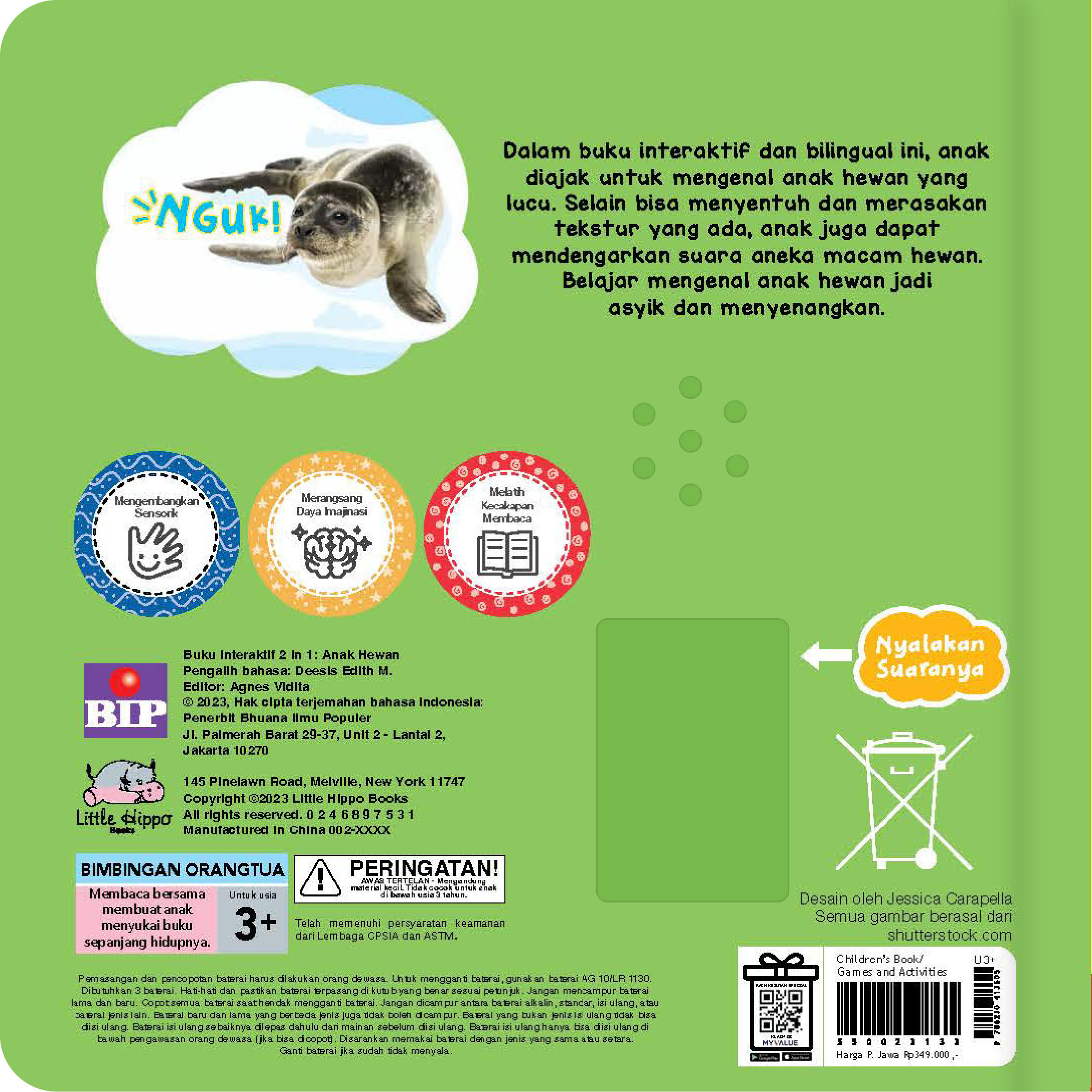 Dalam buku interaktif dan bilingual ini, anak diajak untuk mengenal anak hewan yang lucu. Selain bisa menyentuh dan merasakan tekstur yang ada, anak juga dapat mendengarkan suara aneka macam hewan. Belajar mengenal anak hewan jadi asyik dan menyenangkan.