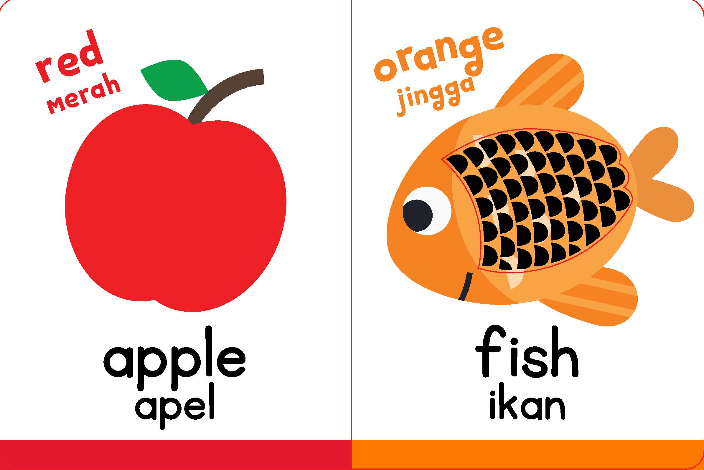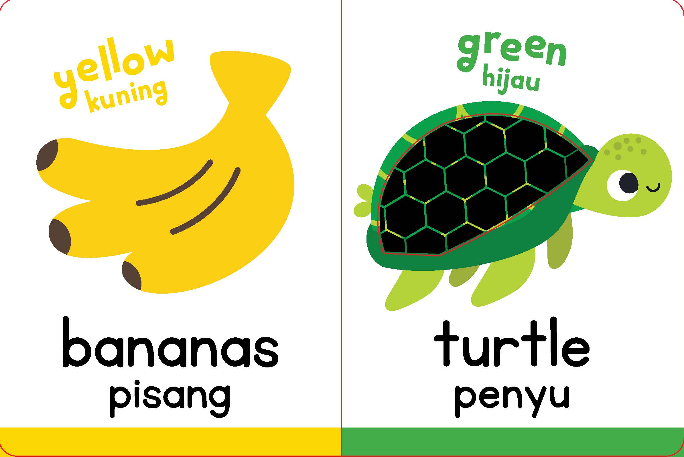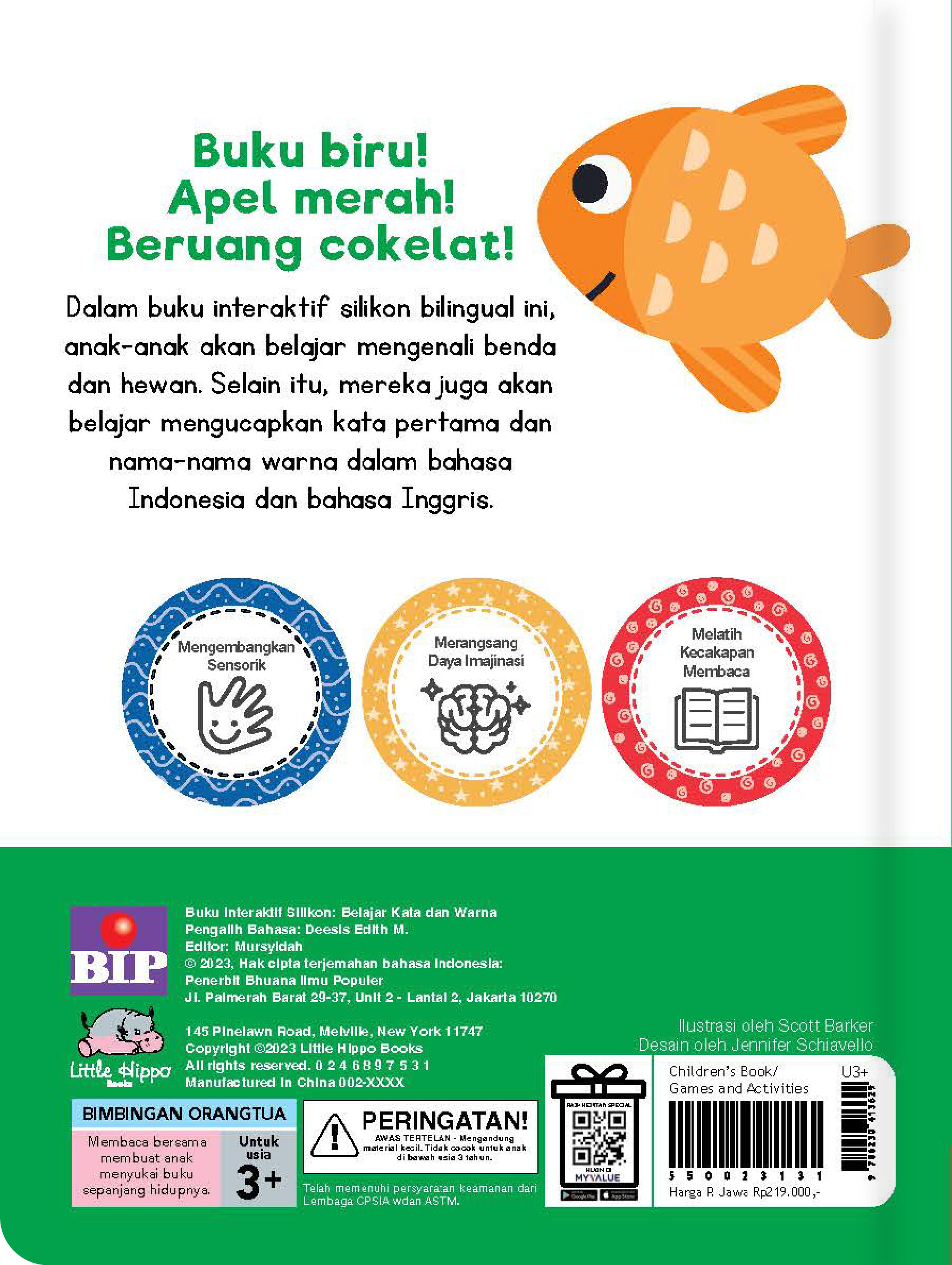 Dalam buku interaktif silikon bilingual ini, anak-anak akan belajar mengenali benda dan hewan. Selain itu, mereka juga akan belajar mengucapkan kata pertama dan nama-nama warna dalam bahasa Indonesia dan bahasa Inggris.