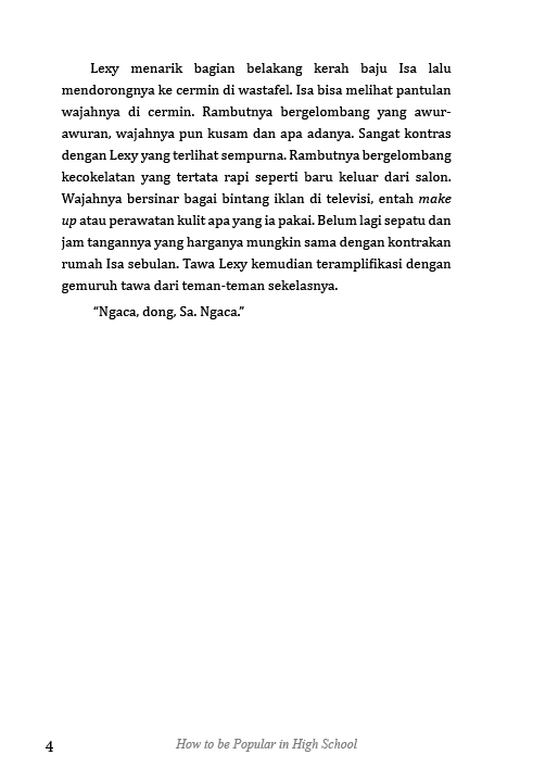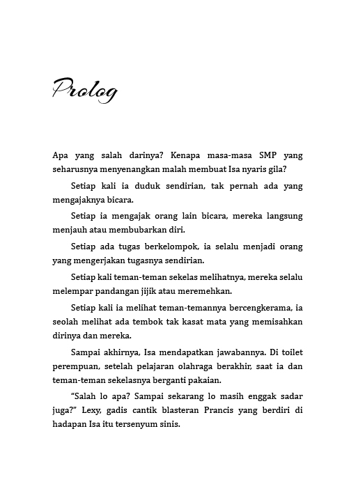 Lexy menarik bagian belakang kerah baju Isa lalu mendorongnya ke cermin di wastafel. Isa bisa melihat pantulan wajahnya di cermin. Rambutnya bergelombang yang awur-awuran, wajahnya pun kusam dan apa adanya. Sangat kontras dengan Lexy yang terlihat sempurna. Rambutnya bergelombang kecokelatan yang tertata rapi seperti baru keluar dari salon. Wajahnya bersinar bagai bintang iklan di televisi, entah make     up atau perawatan kulit apa yang ia pakai. Belum lagi sepatu dan jam tangannya yang harganya mungkin sama dengan kontrakan rumah Isa sebulan. Tawa Lexy kemudian teramplifikasi dengan gemuruh tawa dari teman-teman sekelasnya.