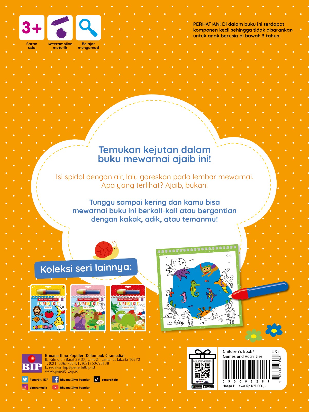 "Buku ini merupakan buku interaktif yang diwarnai menggunakan air. Isi spidol dengan air, lalu goreskan pada lembar mewarnai. Warna akan muncul dengan ajaib!