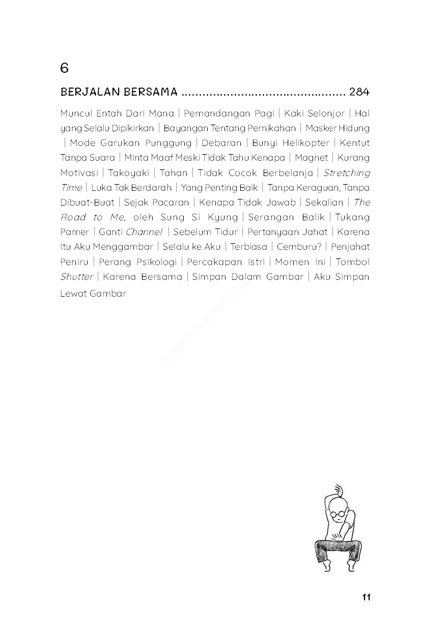 Aku suka menggambar keseharian keluarga kami dan mengunggahnya ke media sosial. Meskipun bukan cerita yang panjang, tetapi banyak orang menyukainya. Terutama karena istriku sangat menyukai gambarku, aku jadi terus menggambar. Akhirnya, keseharian kami tergambar selembar demi selembar dan menjadi tumpukan tebal di ruang kerja. Lalu, menjadi buku bertemakan tentang kegiatan sehari-hari.