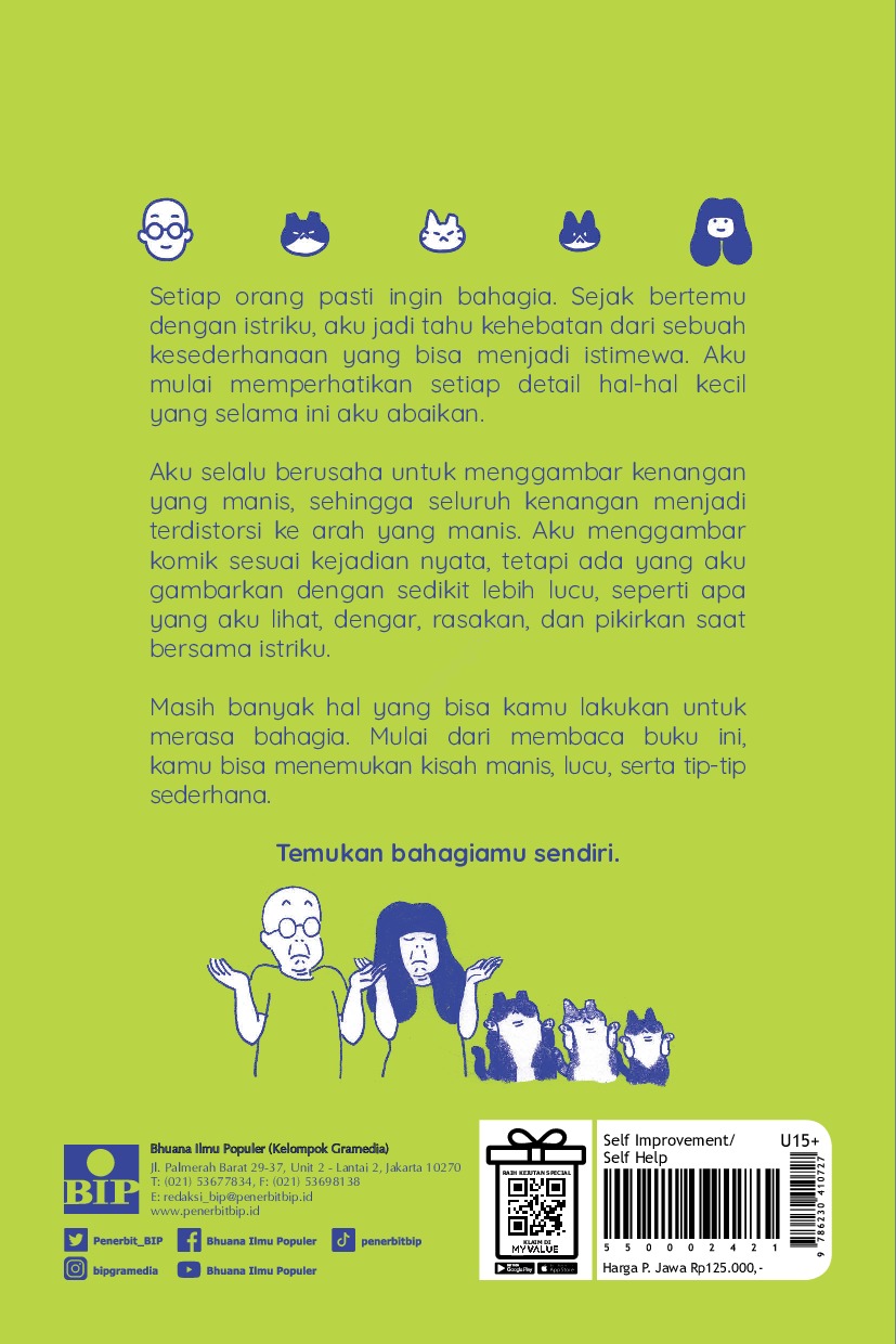 Setiap orang pasti ingin bahagia. Sejak bertemu dengan istriku, aku jadi tahu kehebatan dari sebuah kesederhanaan yang bisa menjadi istimewa. Aku mulai memperhatikan setiap detail hal-hal kecil yang selama ini aku abaikan. Aku selalu berusaha untuk menggambar kenangan yang manis, sehingga seluruh kenangan menjadi terdistorsi ke arah yang manis. Aku menggambar komik sesuai kejadian nyata, tetapi ada yang aku gambarkan dengan sedikit lebih lucu, seperti apa yang aku lihat, dengar, rasakan, dan pikirkan saat bersama istriku. Masih banyak hal yang bisa kamu lakukan untuk merasa bahagia. Mulai dari membaca buku ini, kamu bisa menemukan kisah manis, lucu, serta tip-tip sederhana. Temukan bahagiamu sendiri!