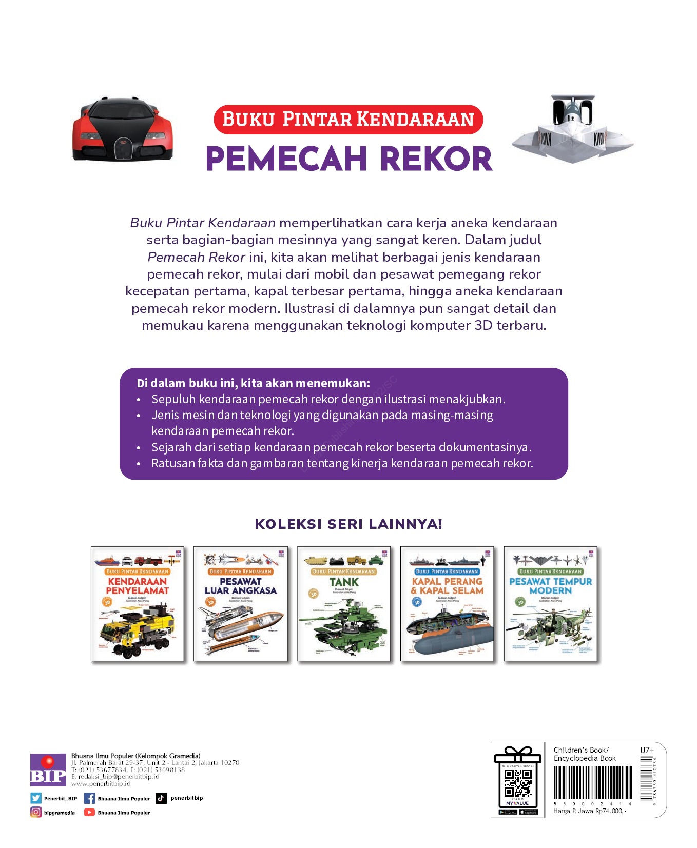 Buku Pintar Kendaraan memperlihatkan cara kerja aneka kendaraan serta bagian-bagian mesinnya yang sangat keren. Dalam judul Pemecah Rekor ini, kita akan melihat berbagai jenis kendaraan pemecah rekor, mulai dari mobil dan pesawat pemegang rekor kecepatan pertama, kapal terbesar pertama, hingga aneka kendaraan pemecah rekor modern. Ilustrasi di dalamnya pun sangat detail dan sungguh memukau karena menggunakan teknologi komputer terbaru. Buku Pintar Kendaraan memberikan pengetahuan dasar tentang aneka kendaraan yang terbagi atas berbagai topik. Daya tarik lain dari buku ini adalah penjelasannya yang sederhana dan terstruktur, serta ilustrasi 3D yang detail dan foto asli sebagai pelengkap