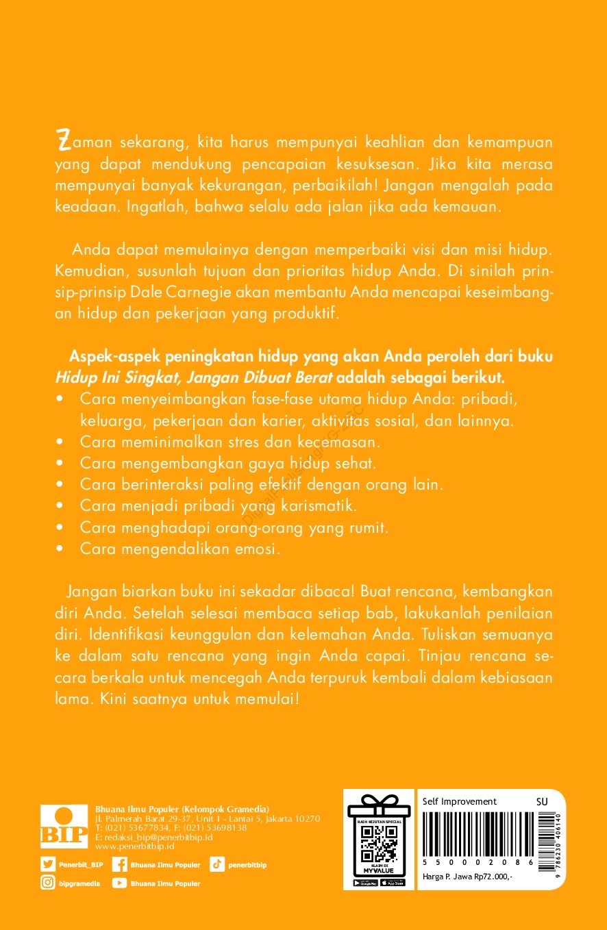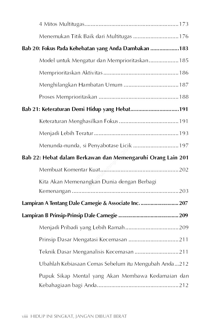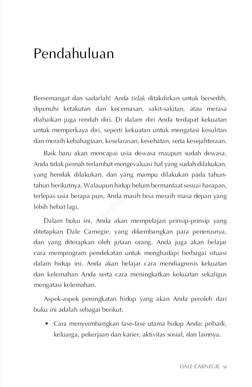 Dalam buku ini, Anda akan mempelajari prinsip-prinsip yang ditetapkan Dale Carnegie, yang dikembangkan para penerusnya, dan yang diterapkan oleh jutaan orang. Anda juga akan belajar cara memprogram pendekatan untuk menghadapi berbagai situasi dalam hidup ini. Anda akan belajar cara mendiagnosis kekuatan dan kelemahan Anda serta cara meningkatkan kekuatan sekaligus mengatasi kelemahan. Aspek-aspek peningkatan hidup yang akan Anda peroleh dari buku ini adalah sebagai berikut. Cara menyeimbangkan fase-fase utama hidup Anda: pribadi, keluarga, pekerjaan dan karier, aktivitas sosial, dan lainnya. Cara meminimalkan stres dan kecemasan. Cara mengembangkan gaya hidup sehat. Cara berinteraksi paling efektif dengan orang lain. Cara menjadi pribadi yang karismatik. Cara menghadapi orang-orang yang rumit. Cara mengendalikan emosi Anda. Dalam menerapkan prinsip-prinsip ini, pahami cara Anda sekarang dalam menghadapi tuntutan hidup. Untuk membantu mengidentifikasi sifat-sifat tersebut dan menunjukkan kebutuhan khusus, dalam buku ini, Anda akan menemukan inventori yang dikelola sendiri untuk mengidentifikasi keunggulan dan dalam berbagai bidang hidup Anda.