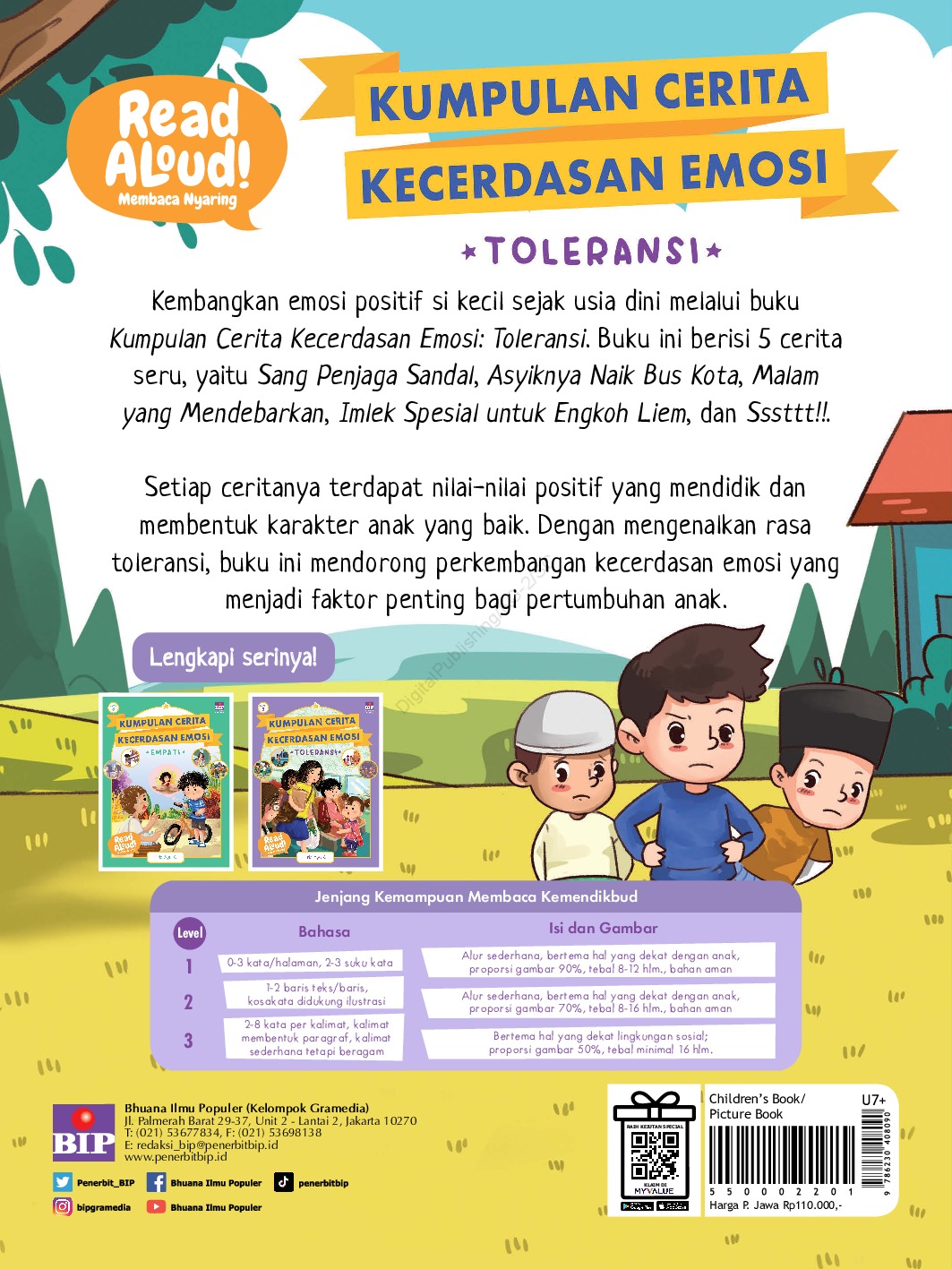 Kembangkan emosi positif si kecil sejak usia dini melalui buku Kumpulan Cerita Kecerdasan Emosi: Toleransi. Buku ini berisi 5 cerita seru, yaitu Sang Penjaga Sandal, Asyiknya Naik Bus Kota, Malam yang Mendebarkan, Imlek Spesial untuk Engkoh Liem, dan Sssstt!! Setiap ceritanya terdapat nilai-nilai positif yang mendidik dan membentuk karakter anak yang baik. Dengan mengenalkan rasa toleransi, buku ini mendorong perkembangan kecerdasan emosi yang menjadi faktor penting bagi pertumbuhan anak.