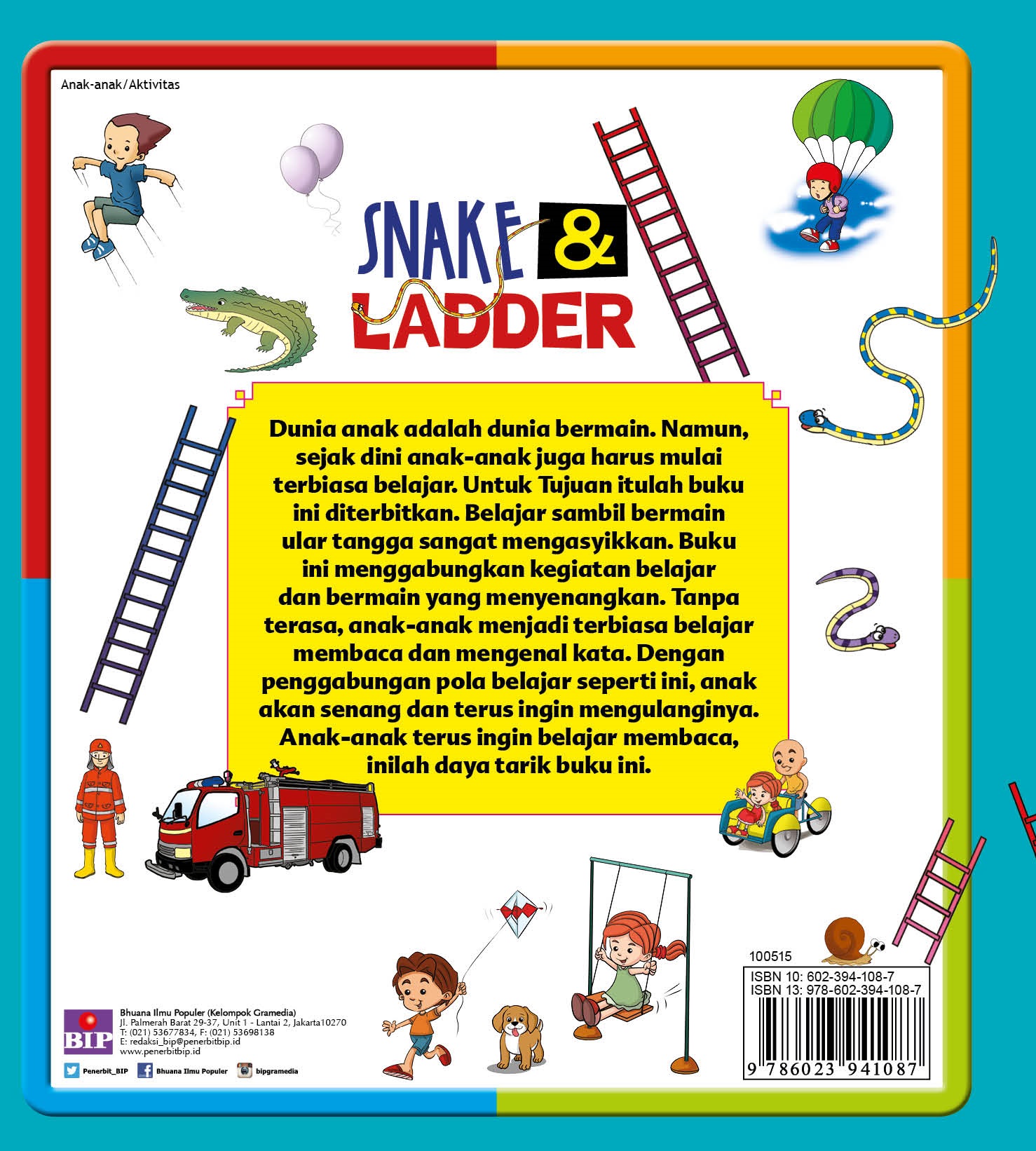 Belajar membaca dengan bermain ular Tangga untuk memperkenalkan kosakata pada anak-anak, baik kosakata Indonesia saja maupun kosakata dwibahasa Indonesia-Inggris.