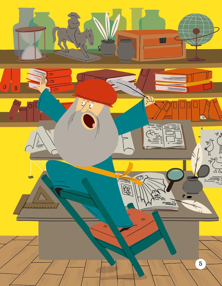 “Dengan mesin ciptaanku, manusia bisa terbang di atas kota-kota dan desa-desa. Aku hampir menyelesaikannya. Besok, aku akan memesan kayu dan kain untuk membuatnya!”