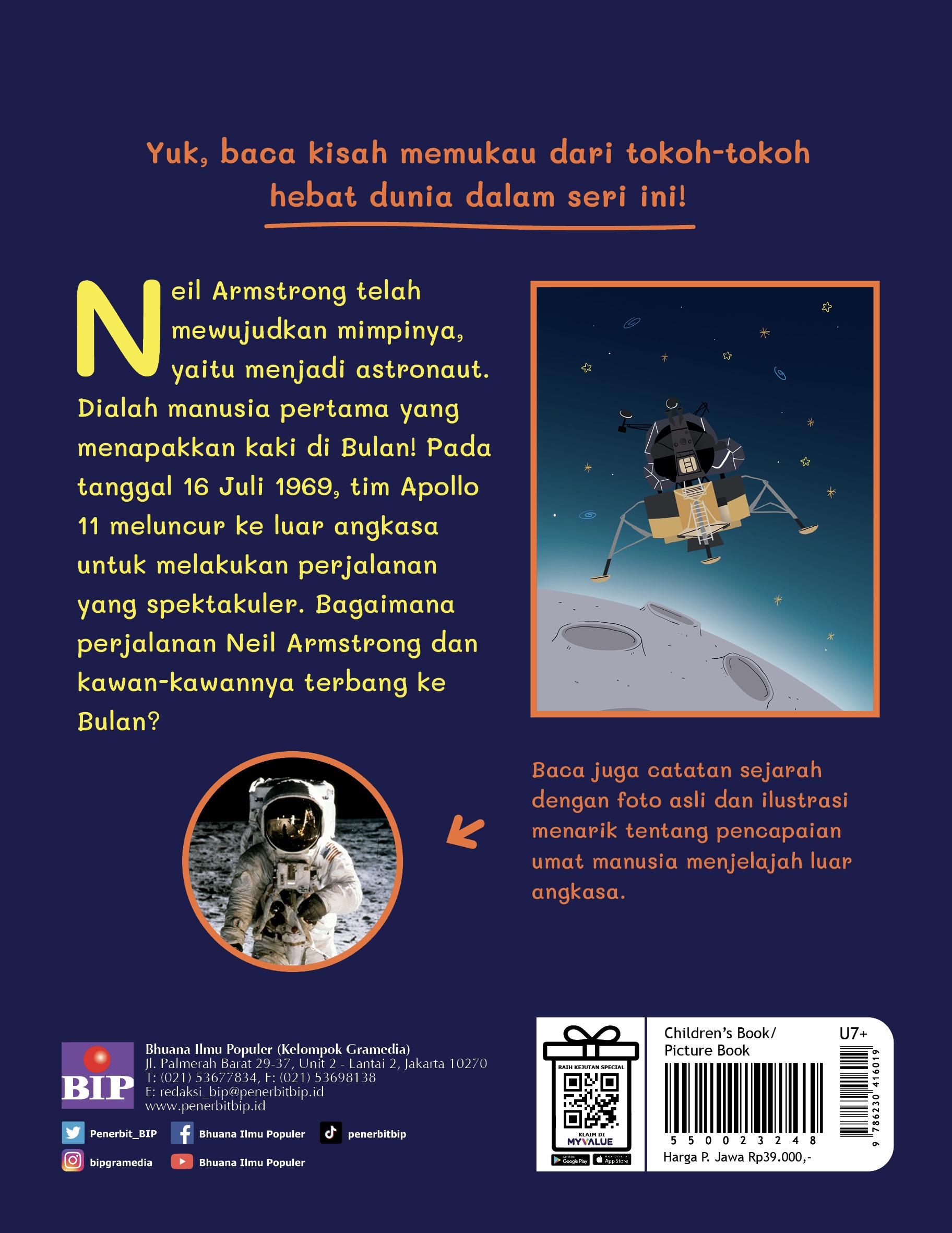 Neil Armstrong telah mewujudkan mimpinya, yaitu menjadi astronaut. Dialah manusia pertama yang menapakkan kaki di Bulan! Pada tanggal 16 Juli 1969, tim Apollo 11 meluncur ke luar angkasa untuk melakukan perjalanan yang spektakuler. Bagaimana perjalanan Neil Armstrong dan kawan-kawannya terbang ke Bulan?