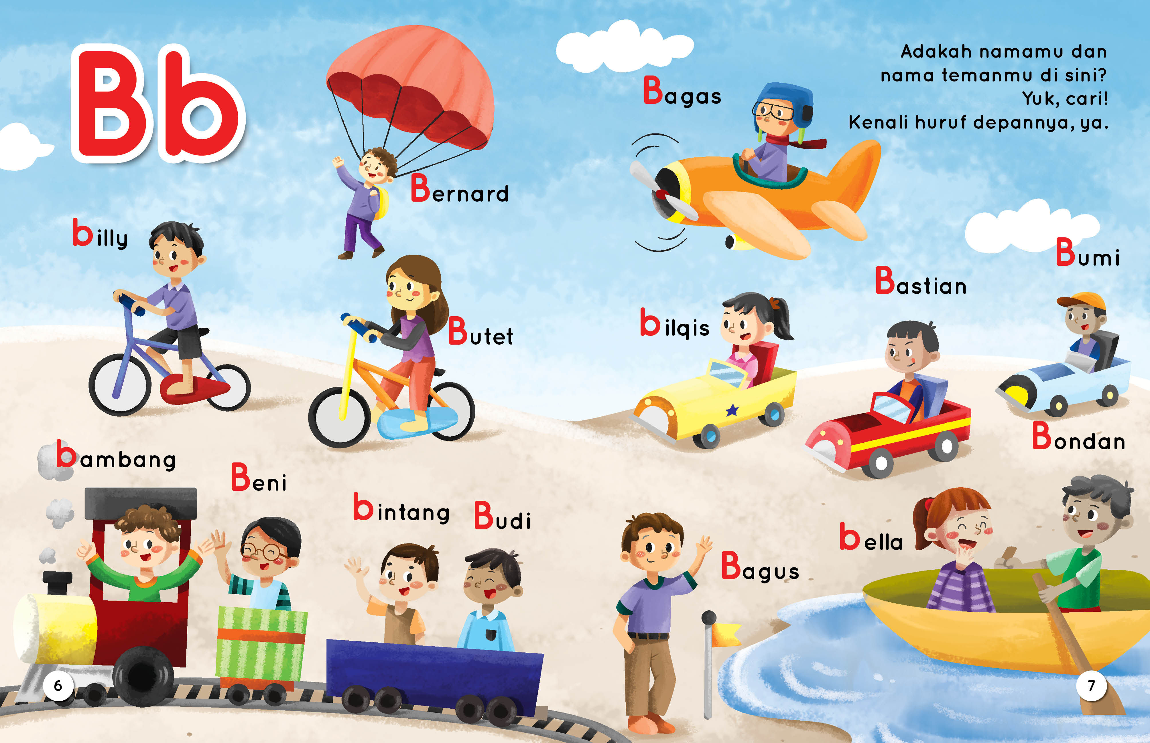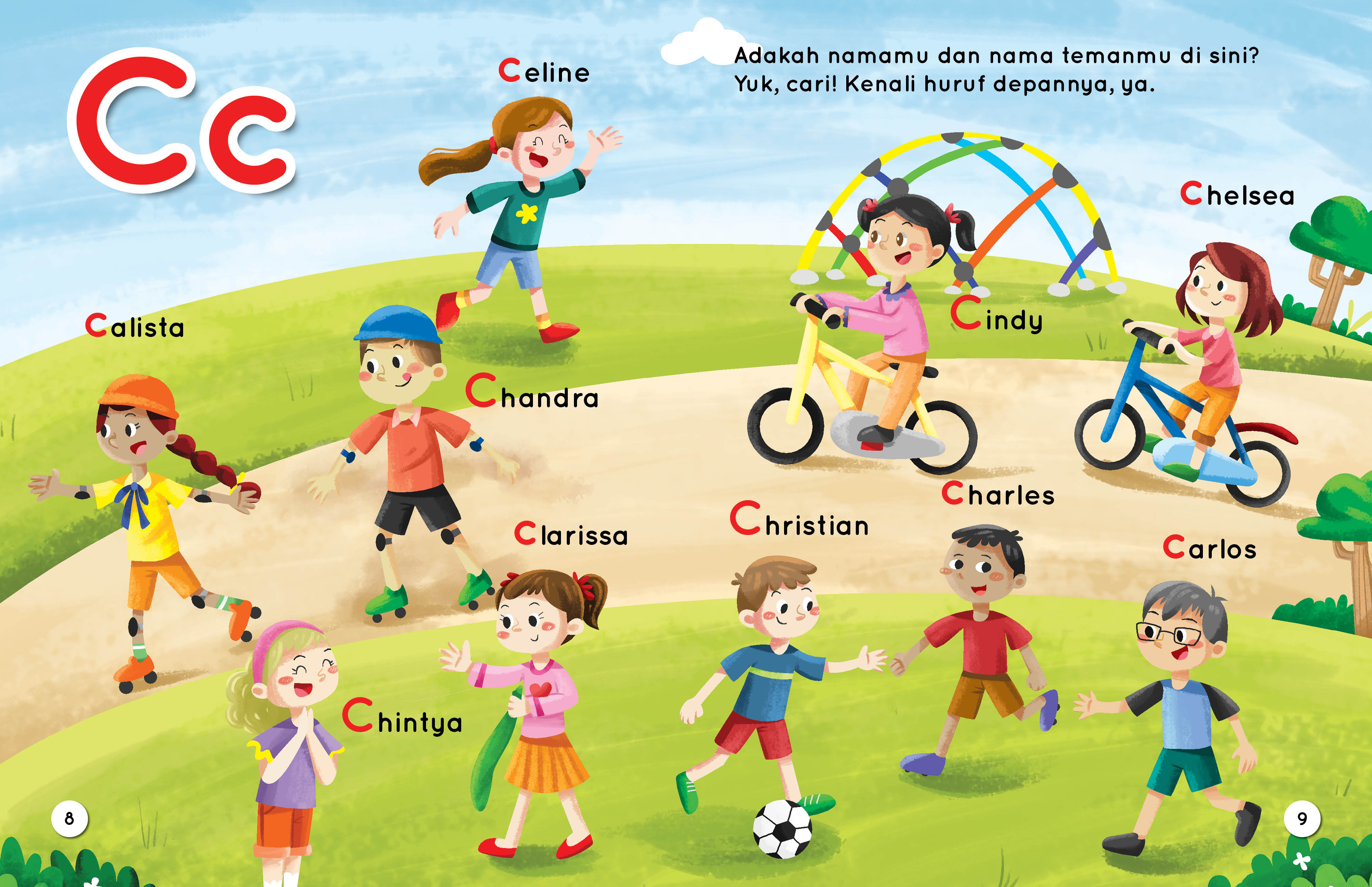 Buku Aktivitas Alfabet Ceria: Nama-Nama, berisikan pengenalan alfabet kepada si kecil melalui berbagai nama temannya dari seluruh Indonesia.