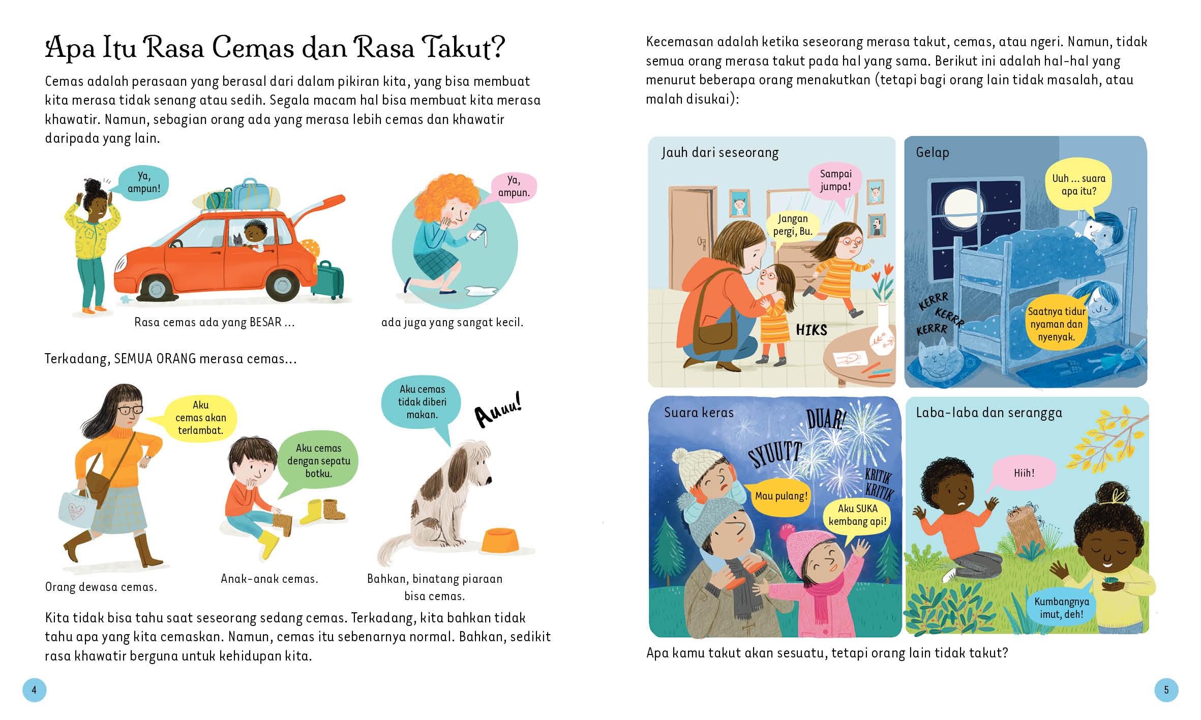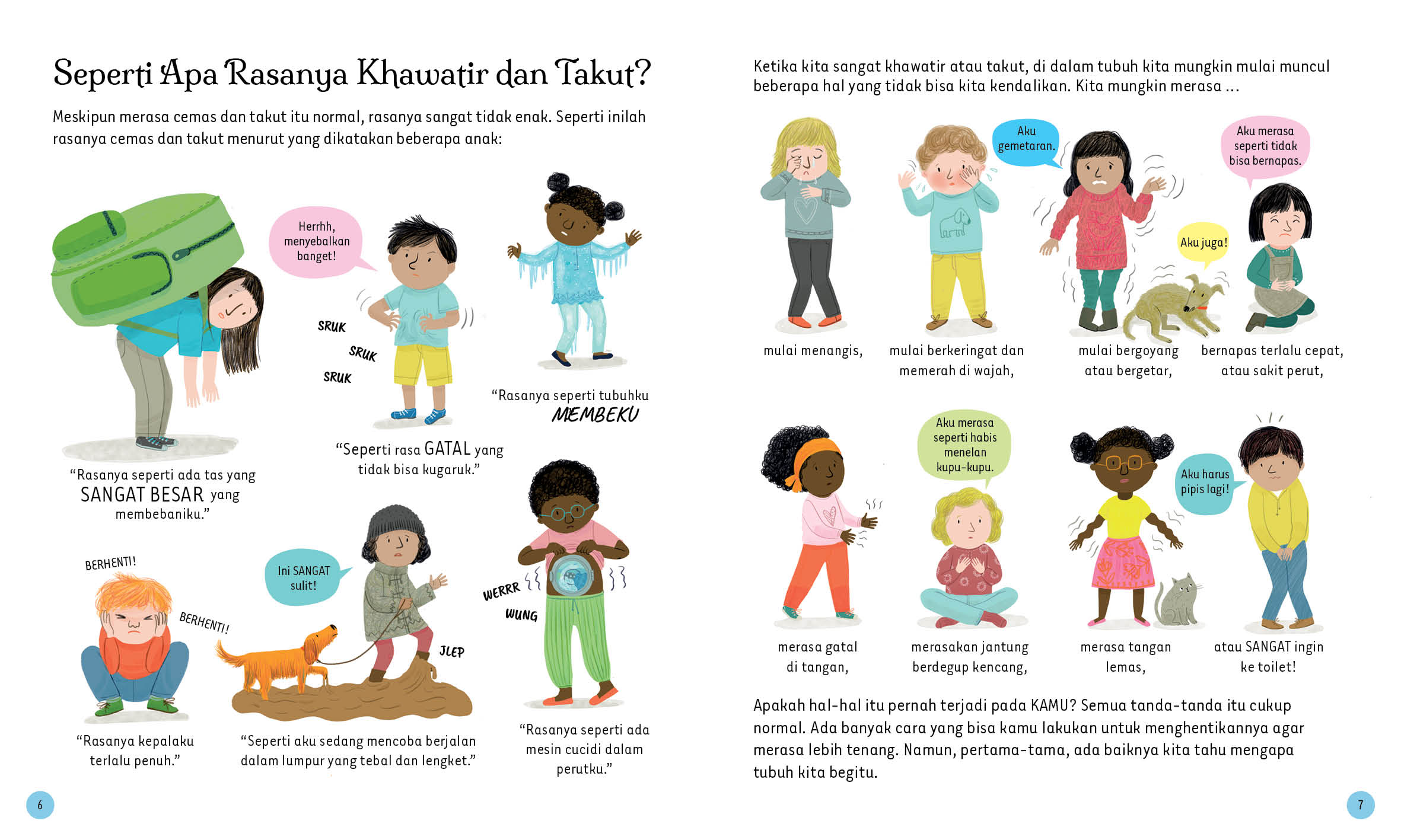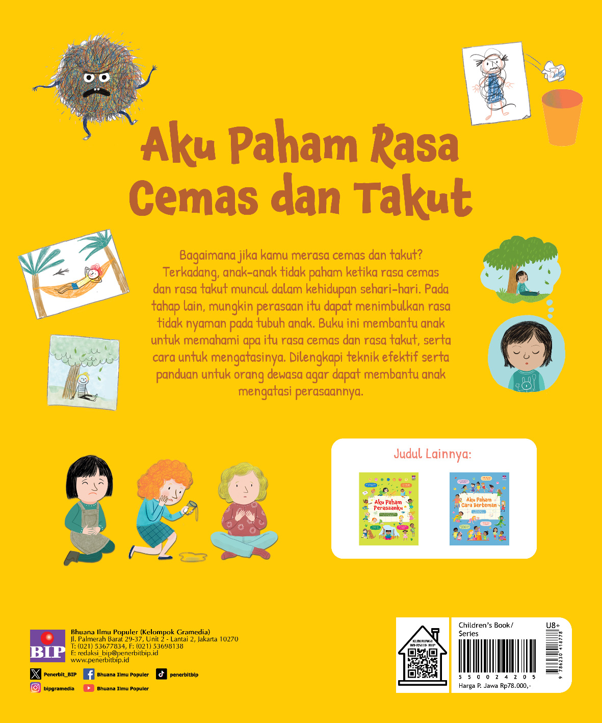 Saat tumbuh besar, anak-anak mulai merasakan perasaan yang sulit dijelaskan, misalnya rasa cemas dan rasa takut. Terkadang, anak-anak pun tidak paham ketika rasa cemas dan rasa takut muncul pada kehidupan sehari-hari. Pada tahap lain, mungkin perasaan itu dapat menimbulkan rasa tidak nyaman pada tubuh anak. Buku ini membantu anak untuk memahami apa itu rasa cemas dan rasa takut, serta cara untuk mengatasinya. Dilengkapi teknik efektif serta panduan untuk orang dewasa agar dapat membantu anak mengatasi perasaannya.