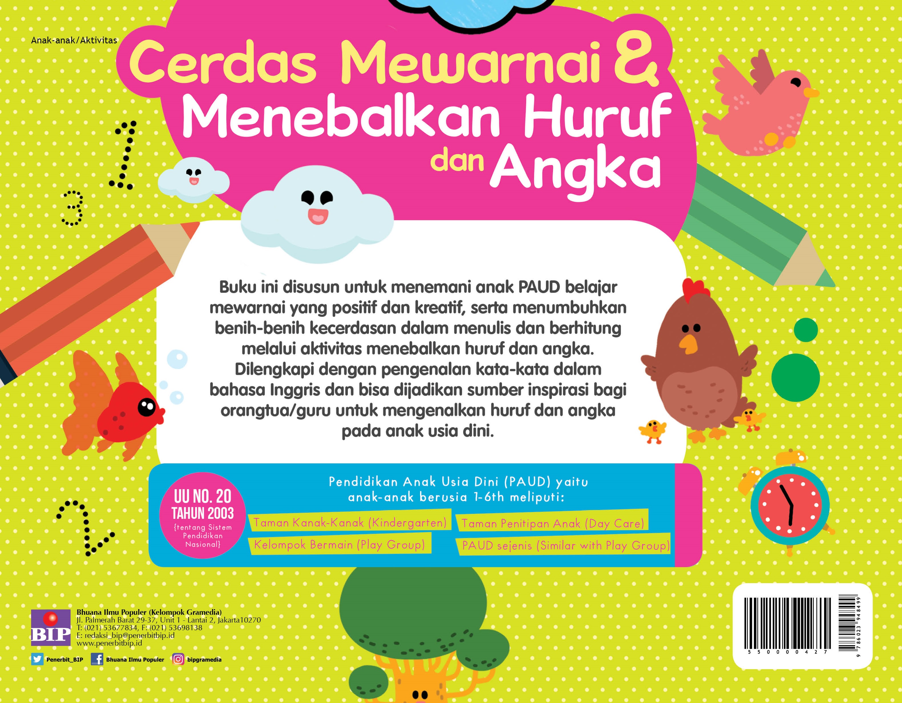 Buku ini disusun untuk menemani anak PAUD belajar mewarnai yang positif dan kreatif, serta menumbuhkan benih-benih kecerdasan dalam menulis dan berhitung melalui aktivitas menebalkan huruf dan angka. Dilengkapi dengan pengenalan kata-kata dalam bahasa Inggris.