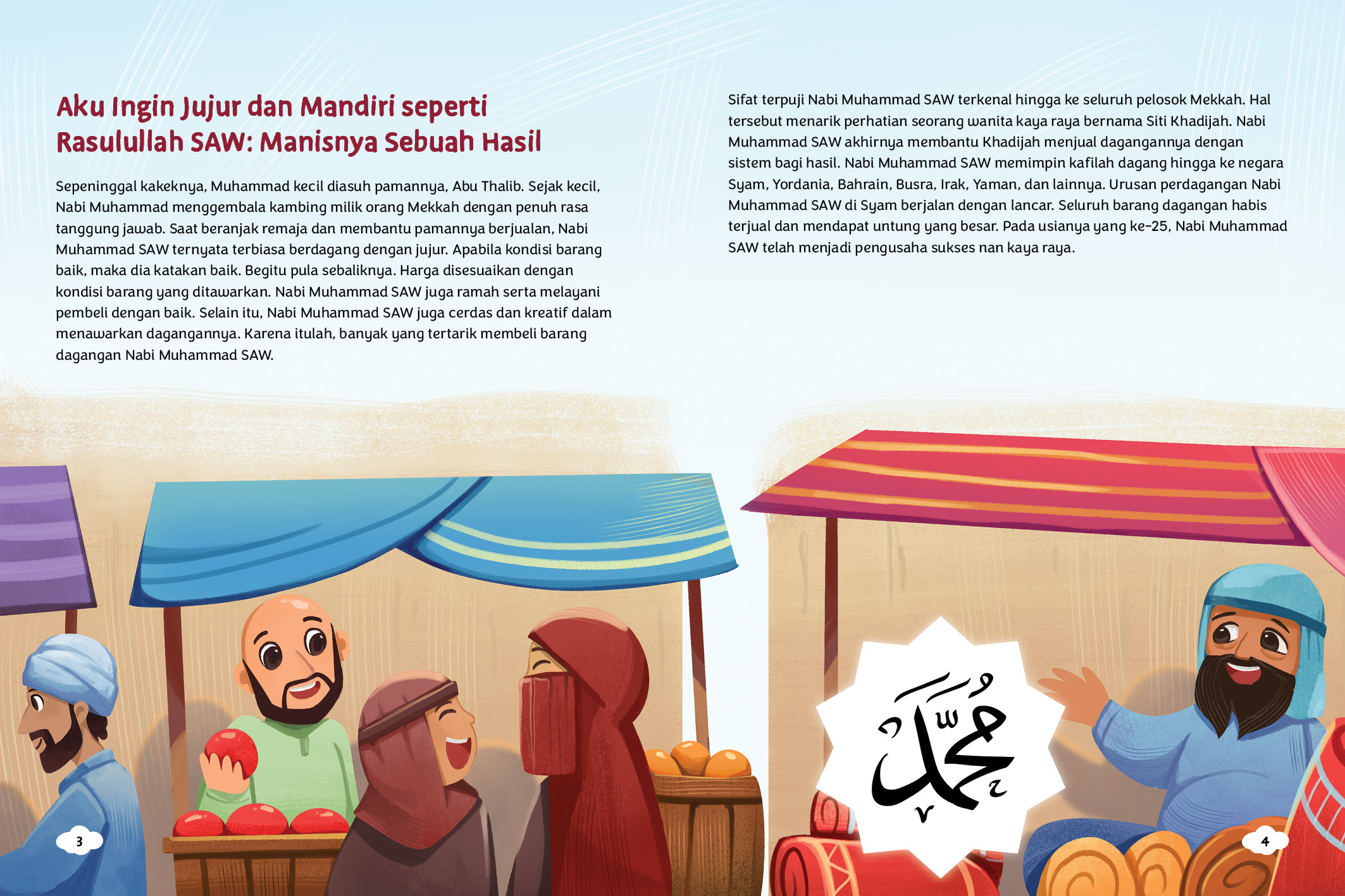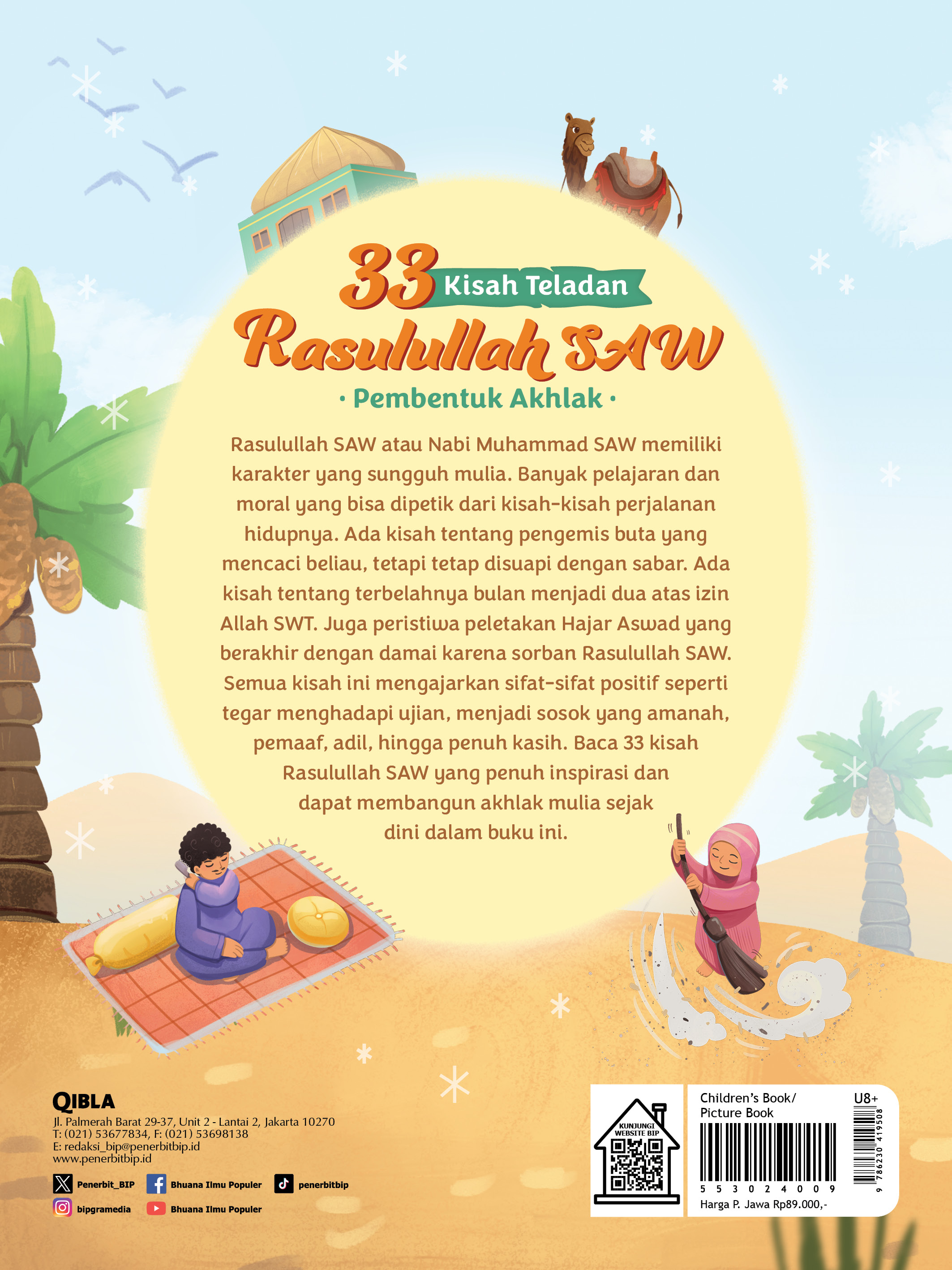 Rasulullah SAW atau Nabi Muhammad SAW memiliki karakter yang sungguh mulia. Banyak pelajaran dan moral yang bisa dipetik dari kisah-kisah perjalanan hidupnya. Ada kisah tentang pengemis buta yang mencaci beliau, tetapi tetap disuapi dengan sabar. Ada kisah tentang terbelahnya bulan menjadi dua atas izin Allah SWT. Juga peristiwa peletakan Hajar Aswad yang berakhir dengan damai karena sorban Rasulullah SAW. Semua kisah ini mengajarkan sifat-sifat positif seperti tegar menghadapi ujian, menjadi sosok yang amanah, pemaaf, adil, hingga penuh kasih. Baca 33 kisah Rasulullah SAW yang penuh inspirasi dan dapat membangun akhlak mulia sejak dini dalam buku ini.