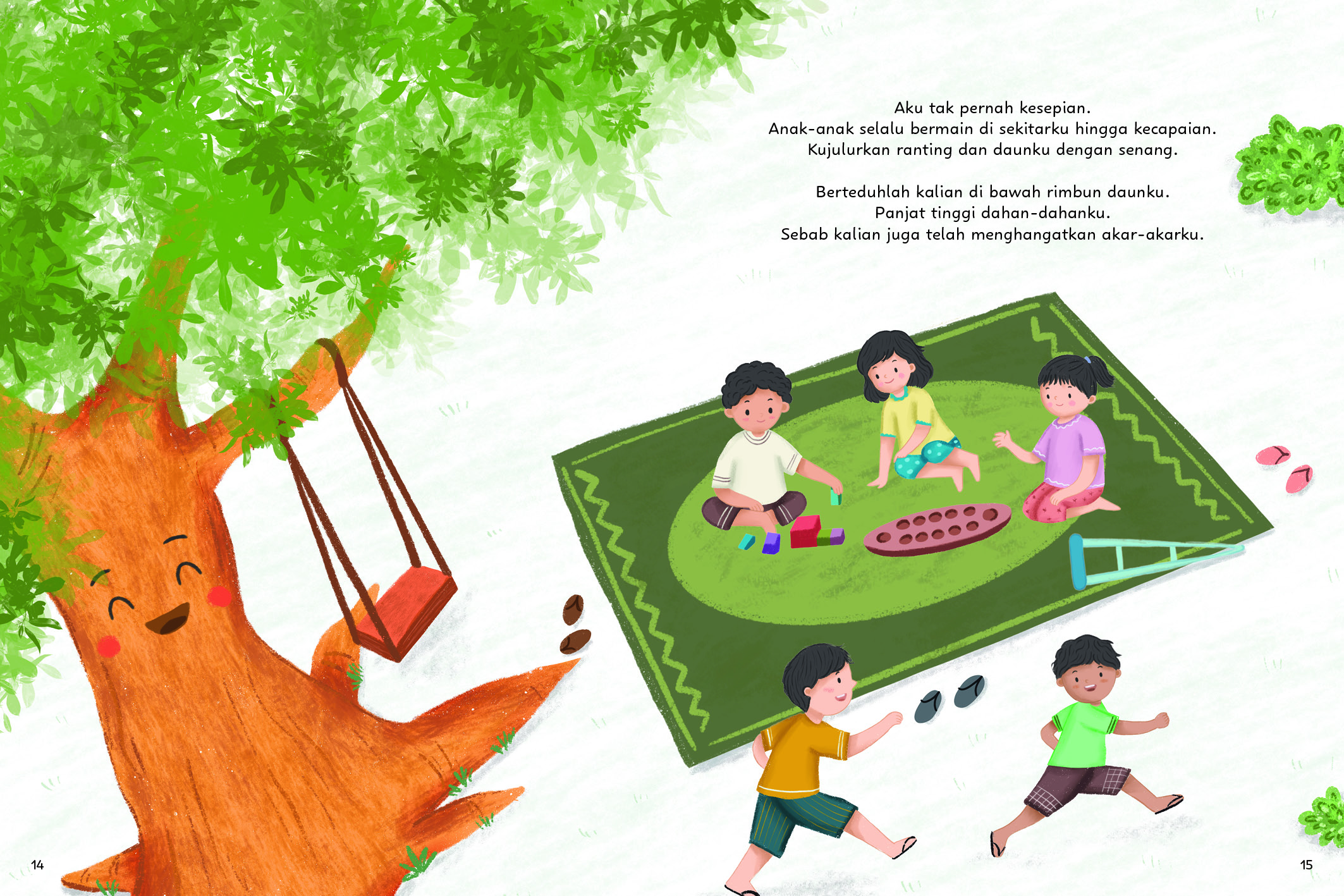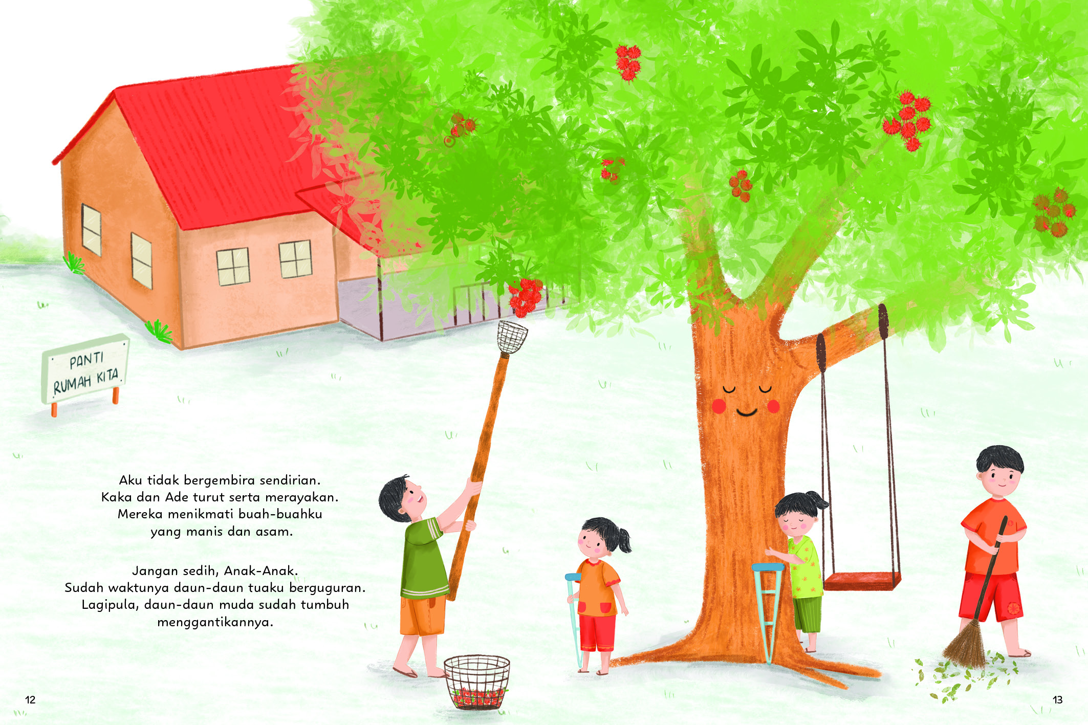 Hai, aku Poram. Aku tinggal di panti bersama Kaka dan Ade. Seiring pertumbuhan mereka, aku juga ikut berubah. Kadang bungaku rontok karena terbawa angin kencang, kadang aku meringis saat badai datang. Namun, aku juga tersenyum saat Kaka, Ade, dan teman-teman berteduh di bawah daunku sewaktu cuaca cerah. Apa lagi, ya, yang akan terjadi padaku di masa depan? Maukah kalian menjadi temanku juga?