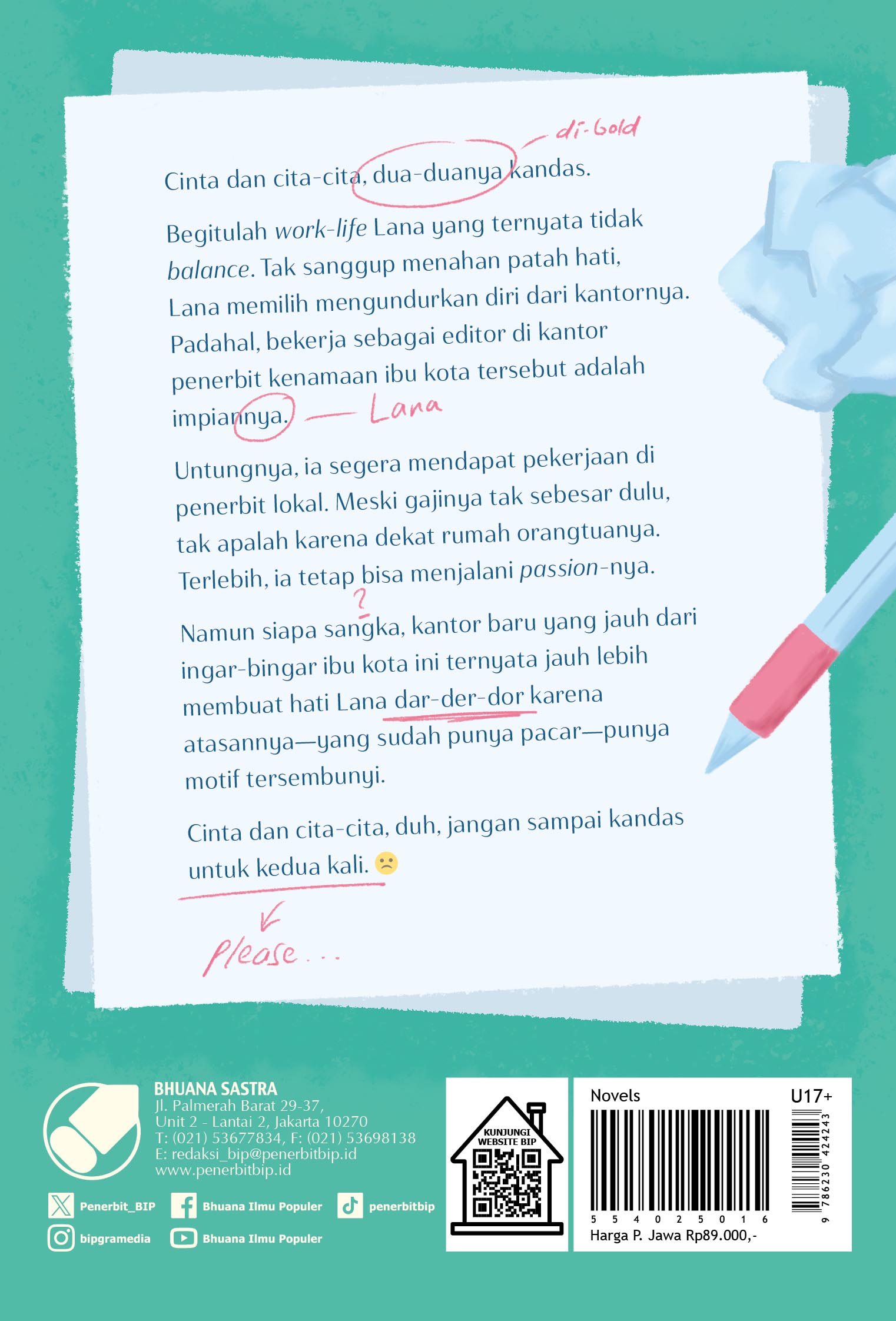 Begitulah work-life Lana yang ternyata tidak balance. Tak sanggup menahan patah hati, Lana memilih mengundurkan diri dari kantornya. Padahal, bekerja sebagai editor di kantor penerbit kenamaan ibu kota tersebut adalah impiannya.