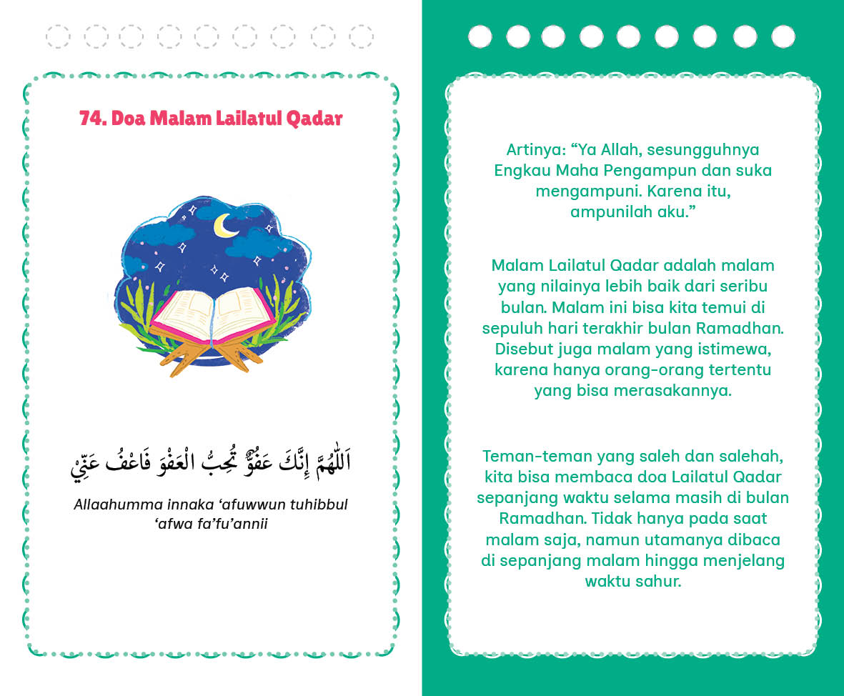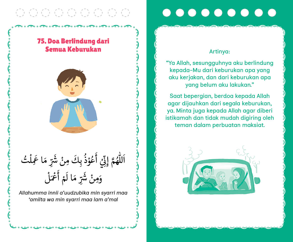 Berdoa menjadi kebutuhan umat islam untuk lebih dekat dengan penciptanya, Allah SWT. Dengan berdoa, kita bisa meminta memohon apapun yang kita inginkan, kita harapkan dan kita butuhkan. Berdoa juga menjadi momen kita untuk berkeluh kesah, mencurahkan segala hal untuk memohon pertolongan, perlindungan dan ketenangan hidup. Allah SWT. sangat senang mendengar doa-doa dari hambanya-Nya dan senantiasa mengabulkannya. Yuk, kita rajin berdoa dengan menghafalkan doa-doa dari buku 101 Doa Harian untuk Anak Muslim!