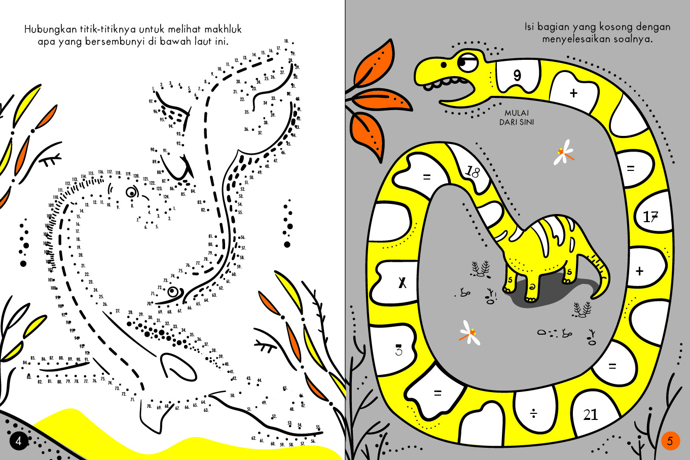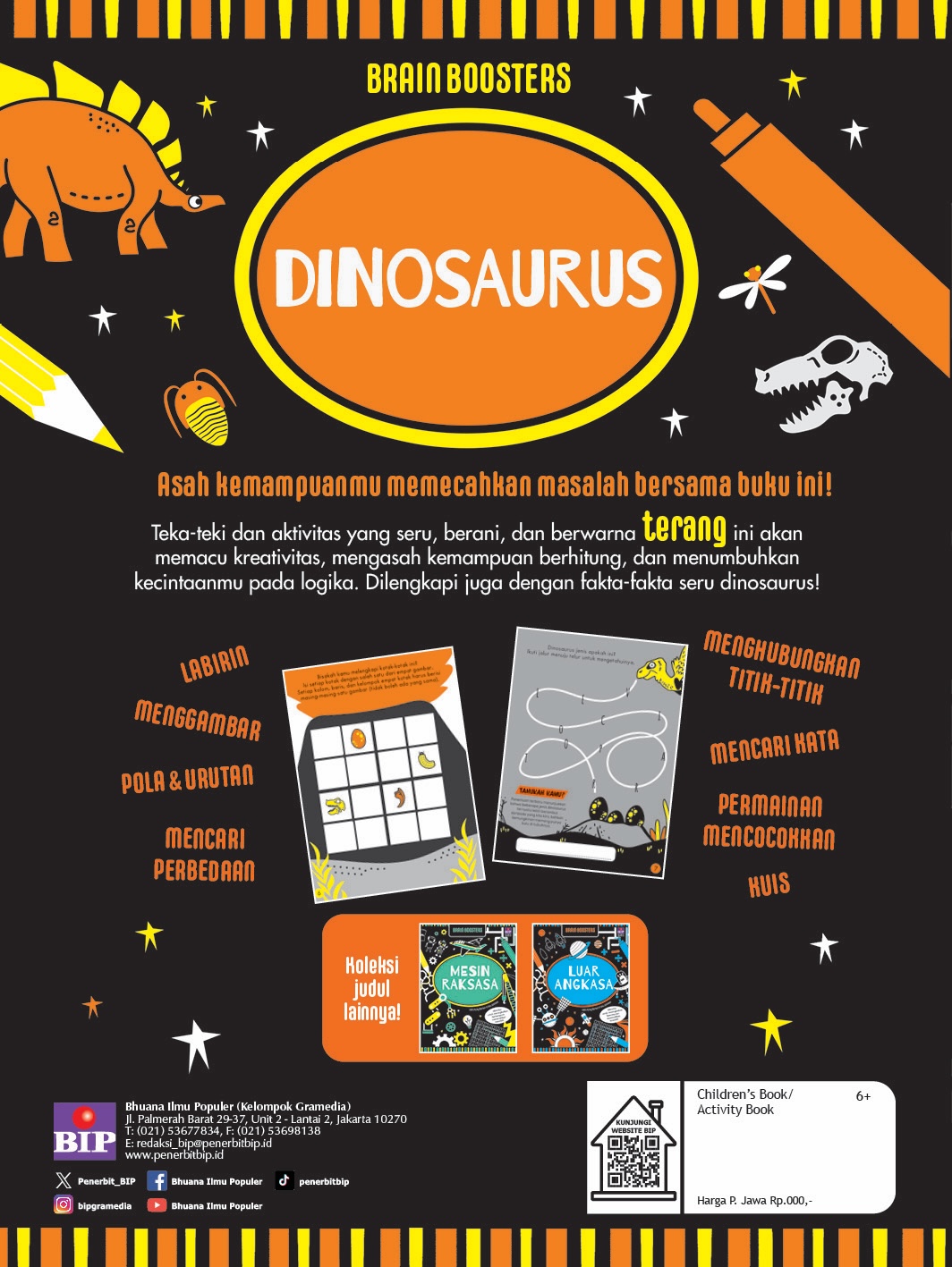 Teka-teki dan aktivitas yang seru, berani, dan berwarna terang ini akan memacu kreativitas, mengasah kemampuan berhitung, dan menumbuhkan kecintaanmu pada logika. Dilengkapi juga dengan fakta-fakta seru dinosaurus!