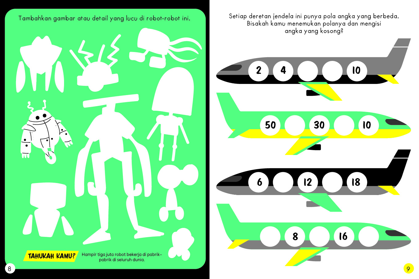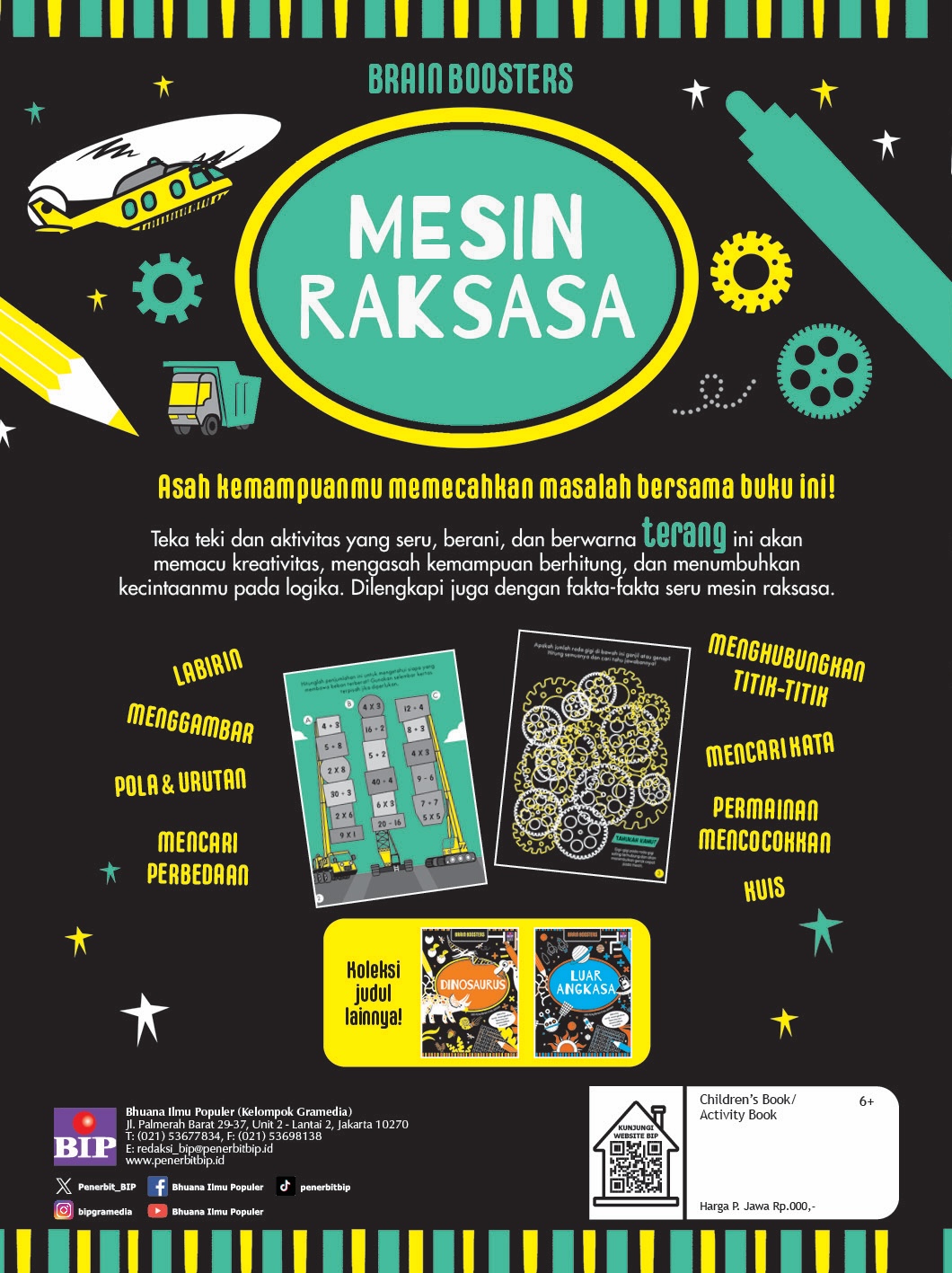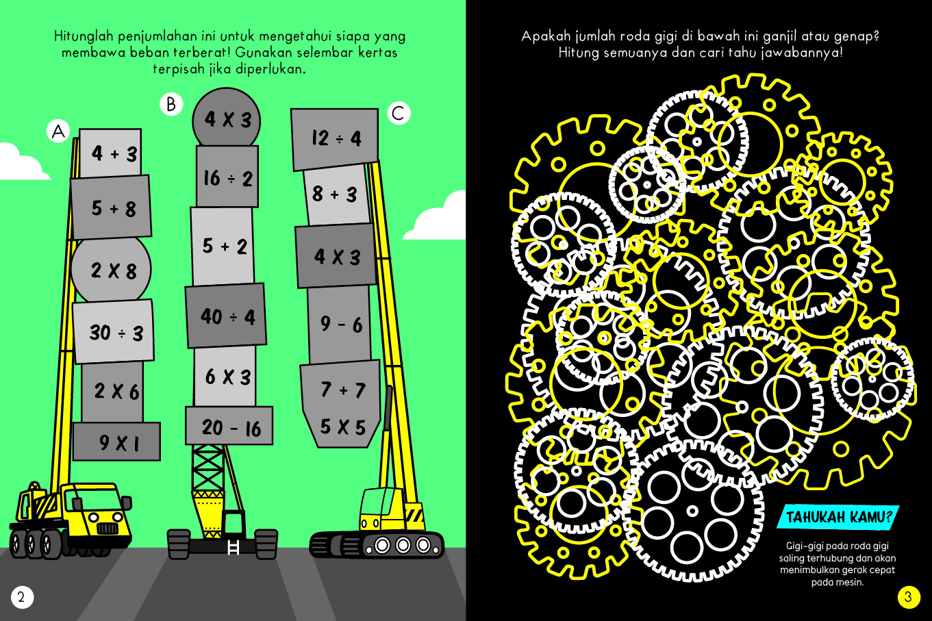 Teka-teki dan aktivitas yang seru, berani, dan berwarna terang ini akan memacu kreativitas, mengasah kemampuan berhitung, dan menumbuhkan kecintaanmu pada logika. Dilengkapi juga dengan fakta-fakta seru tentang mesin raksasa.