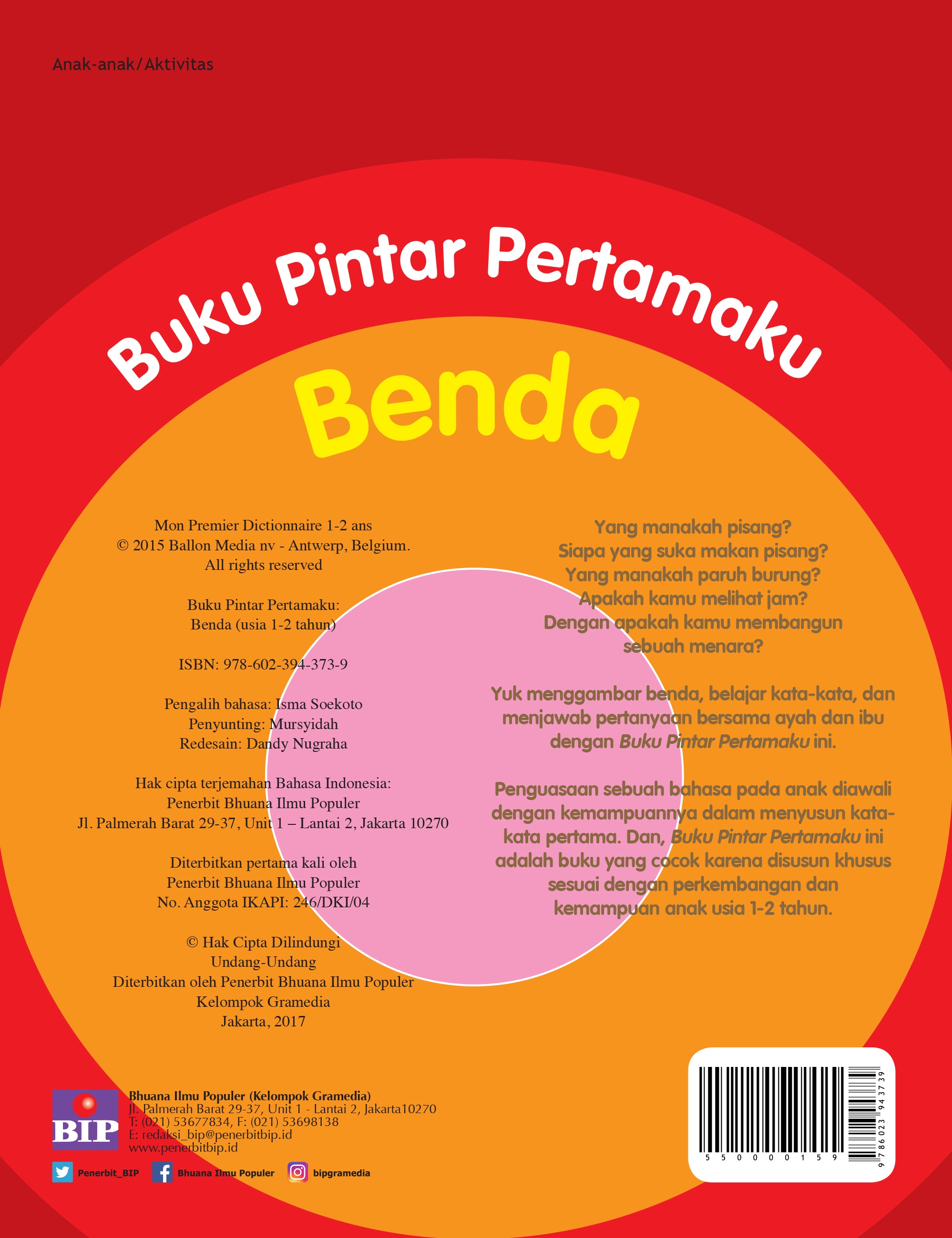 Penguasaan sebuah bahasa pada anak diawali dengan kemampuannya dalam menyusun kata-kata pertama. Dan, buku ini memberikan apa yang dibutuhkan anak-anak usia 1-2 tahun dalam perkembangannya untuk menguasai bahasa. Buku Pintar Pertamaku: Benda ini adalah buku untuk memulai belajar kosakata dasar yang disusun khusus sesuai dengan perkembangan dan kemampuan anak usia 1-2 tahun.