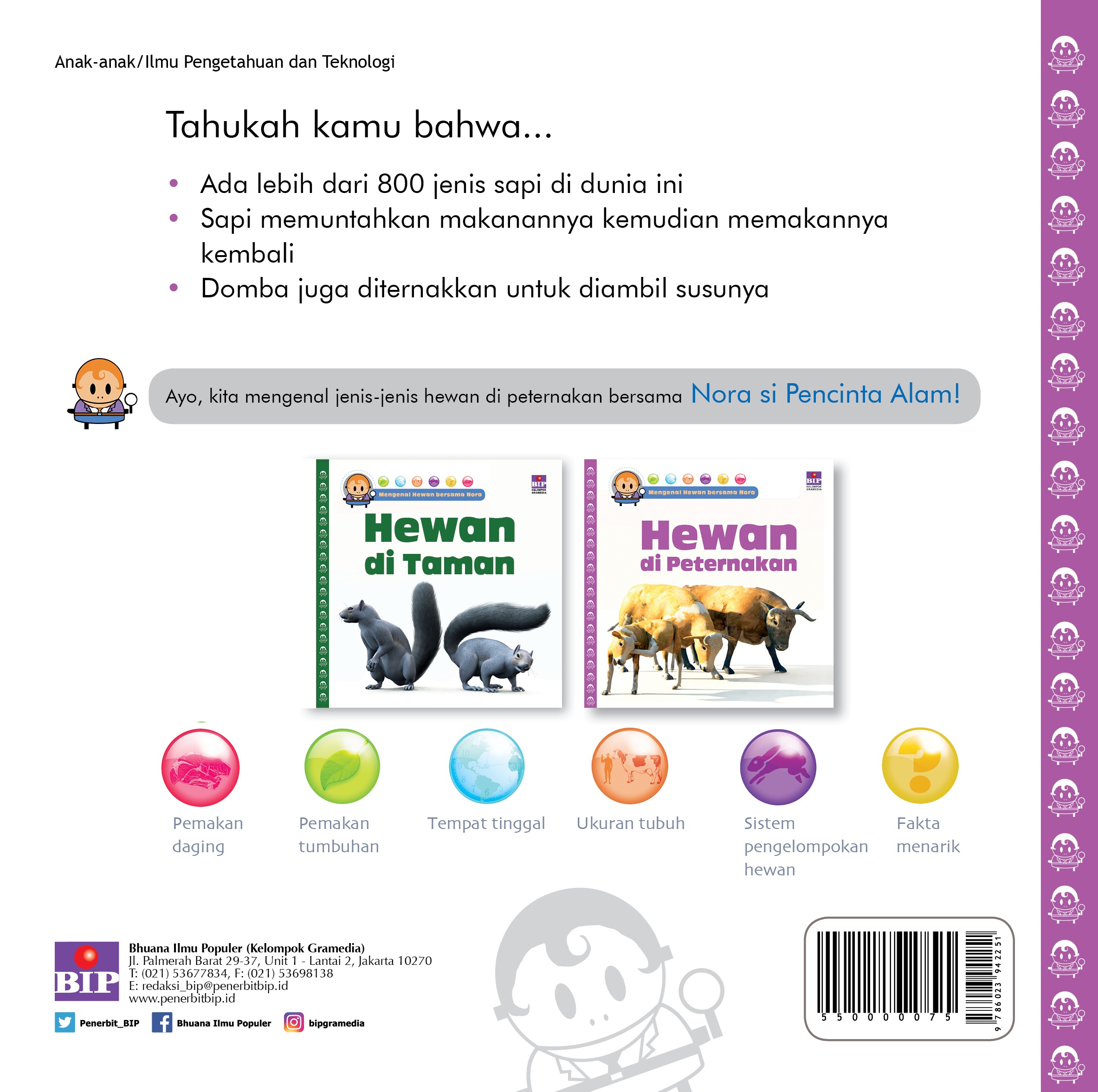 Nora akan mengajak anak-anak untuk mempelajari fakta menarik tentang hewan yang ada di peternakan, mulai dari sapi hingga kucing dan anjing. Buku ini membantu orangtua untuk menjelaskan secara sederhana dan menyenangkan kepada anak-anak tentang hewan-hewan tersebut dengan dengan disertai ilustrasi yang realistis.