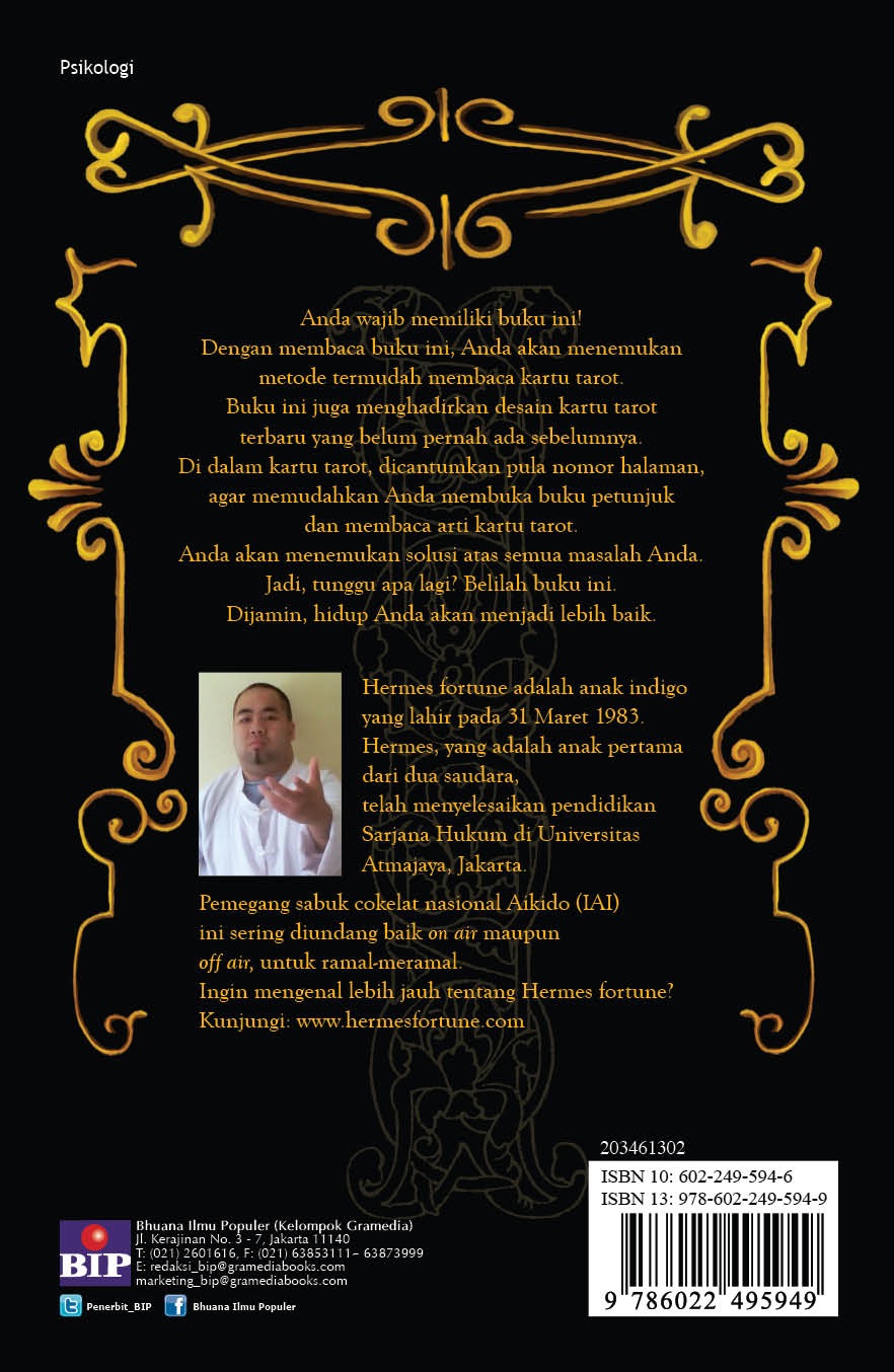 “Hermes Fortuneteller menuntun Anda untuk melangkah pasti ke depan.” Visensius Resubun, Anggota DPRD Maluku Tenggara “Kelebihan dan penglihatan Hermes Membantu saya untuk menimbang dan me-road map-kan pilihan saya secara realitis. Dan, tetap mengembalikan semuanya pada Tuhan.” Gina Fazriya, Artis & Presenter infotainment “Setelah konsultasi dengan Hermes, saya mengetahui prediksi kontrak sinetron yang akan saya mainkan sehingga, secara mental, saya siap dengan kondisi terburuk.” Ginanjar, Entertainer “Sebelum ketemu Hermes, saya tidak percaya dengan yang namanya ramal-meramal! Namun, kebenarannya terbukti setelah ramalannya dibacakan. Hermes tidak hanya meramal, tetapi juga memberi solusi. Gunawan Lieto, Management Consultant Anda wajib memiliki buku ini! Dengan membaca buku ini, Anda akan menemukan metode termudah membaca kartu tarot. Buku ini juga menghadirkan desain kartu tarot terbaru yang belum pernah ada sebelumnya. Di dalam kartu tarot dicantumkan nomor halaman yang akan memudahkan Anda untuk membuka petunjuk yang ada di dalam buku dan membaca arti kartu tarot tersebut. Percayalah! Anda akan menemukan solusi atas semua masalah Anda dengan membaca buku ini. Jadi, tunggu apa lagi? Beli dan pelajari buku yang mudah ini. Dijamin, hidup Anda akan menjadi lebih baik.