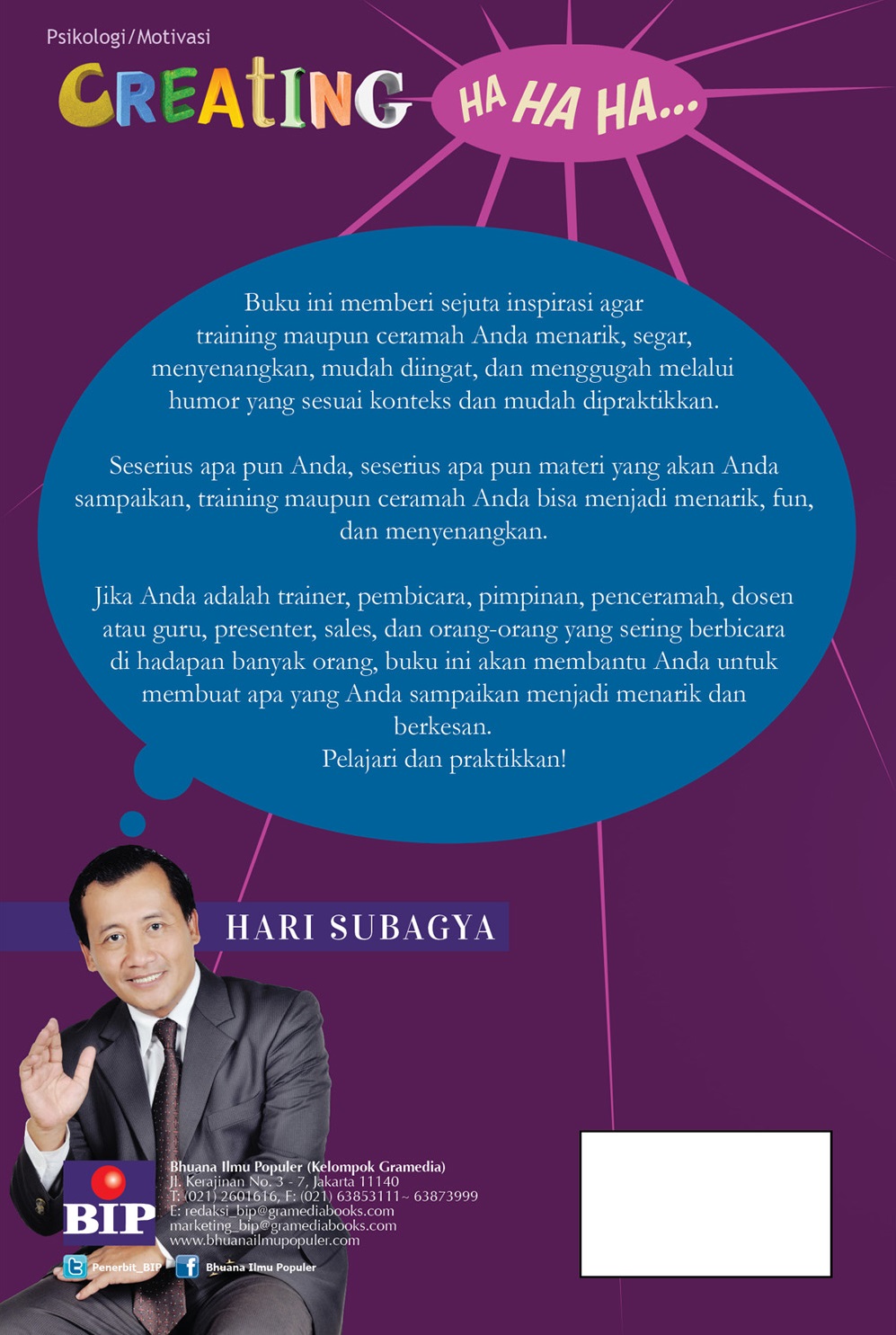 Humor memiliki kedahsyatan yang luar biasa, yang bisa digunakan untuk hal-hal yang ringan hingga hal-hal yang super duper serius. Humor bisa dijadikan senjata menjual, bergaul, hingga dalam kampanye pemilihan Bupati, Gubenur dan Presiden. Humor mampu membangun kedekatan dengan sangat cepat. Humor bisa digunakan untuk menghilangkan kesan sombong dan meruntuhkan tembok keangkuhan. Humor bisa mencairkan kebekuan, dan kutub utara bisa mencair karena humor. CREATING HAHAHA memberi sejuta inspirasi agar training maupun ceramah Anda menarik, segar, menyenangkan, mudah diingat, dan menggugah melalui humor yang sesuai konteks dan mudah dipraktikkan. Seserius apa pun Anda, seserius apa pun materi yang akan Anda sampaikan, training maupun ceramah Anda bisa menjadi menarik, fun, dan menyenangkan.